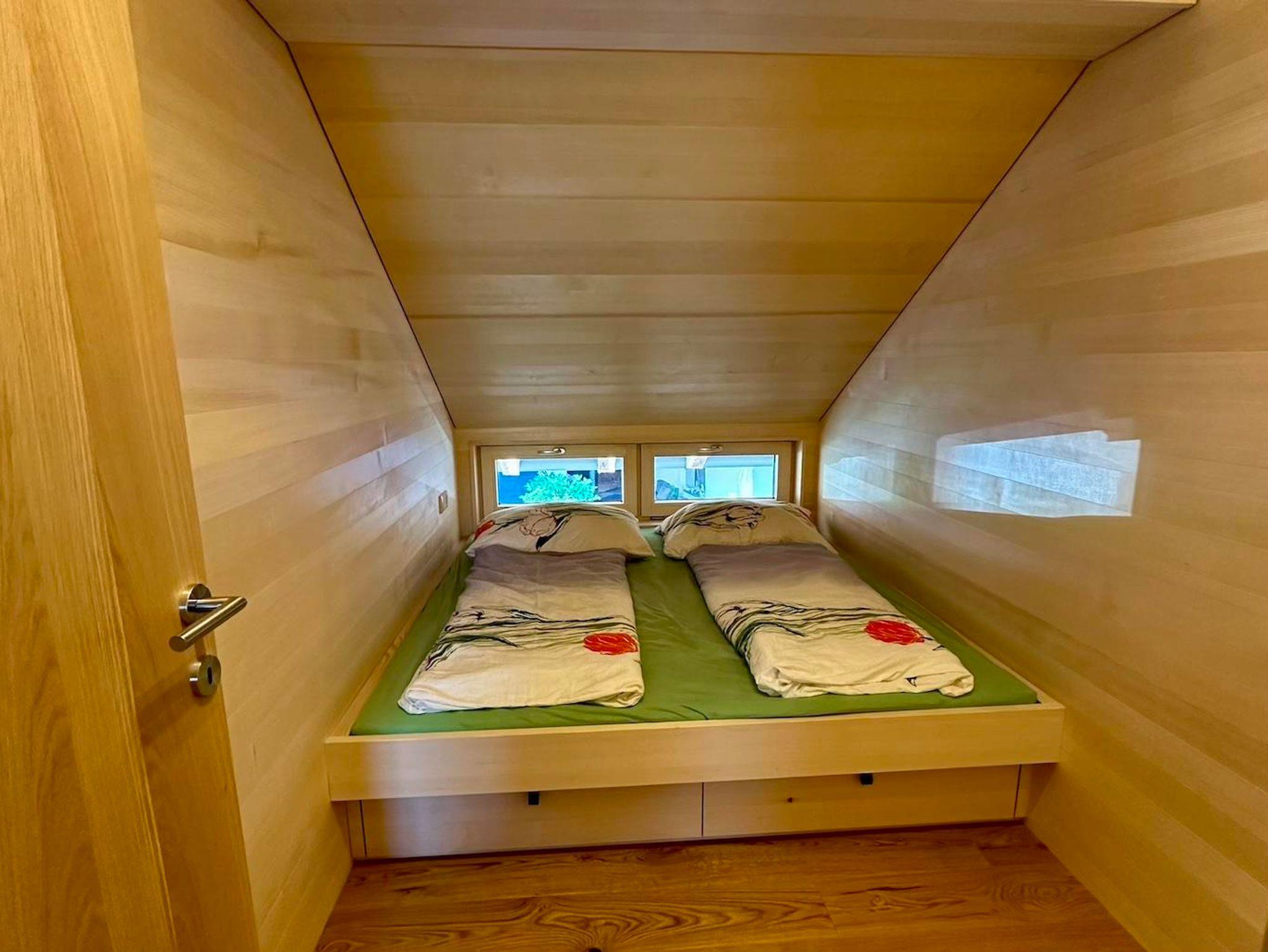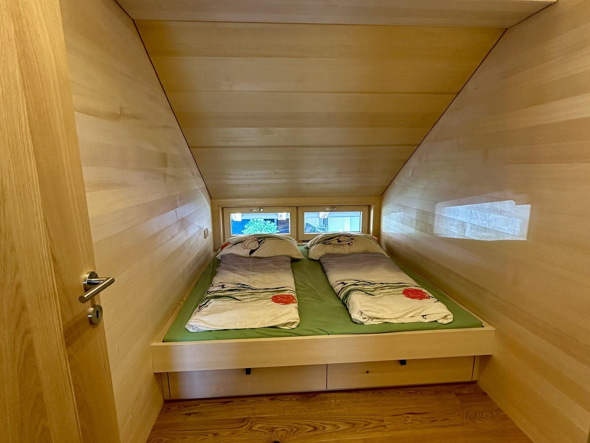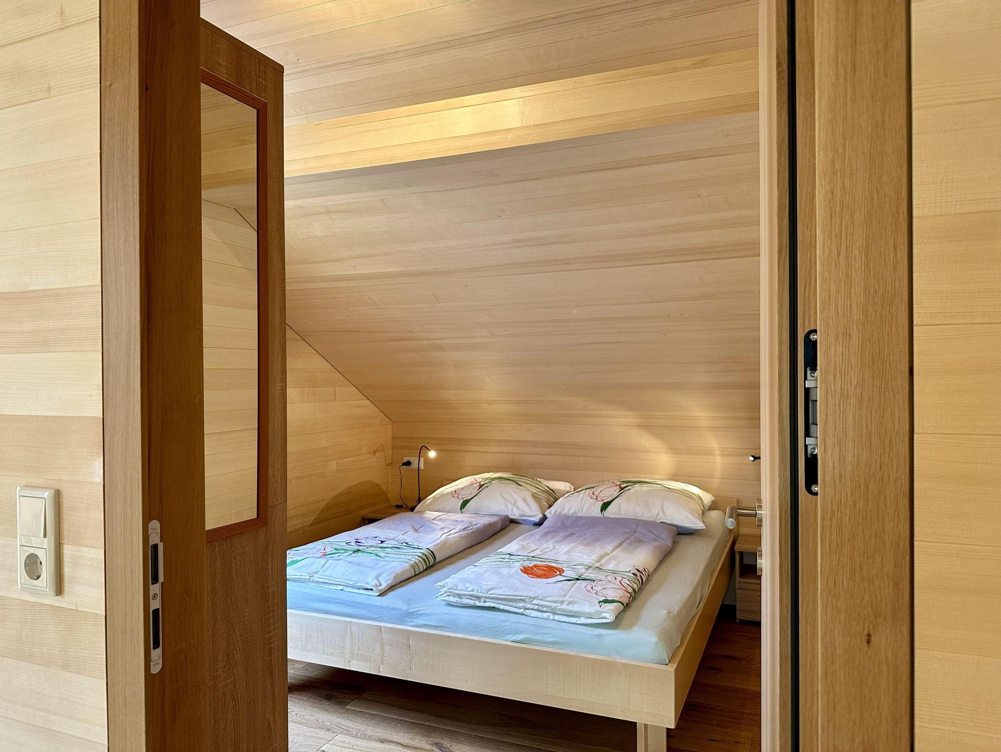 Es gibt zwei Schlafzimmer mit jeweils zwei Doppelbetten. Ein Schlafzimmer verfügt über einen Kasten, Platz für Koffer gibt es in beiden Zimmern. Ein Babybett kann gratis zur Verfügung gestellt werden.