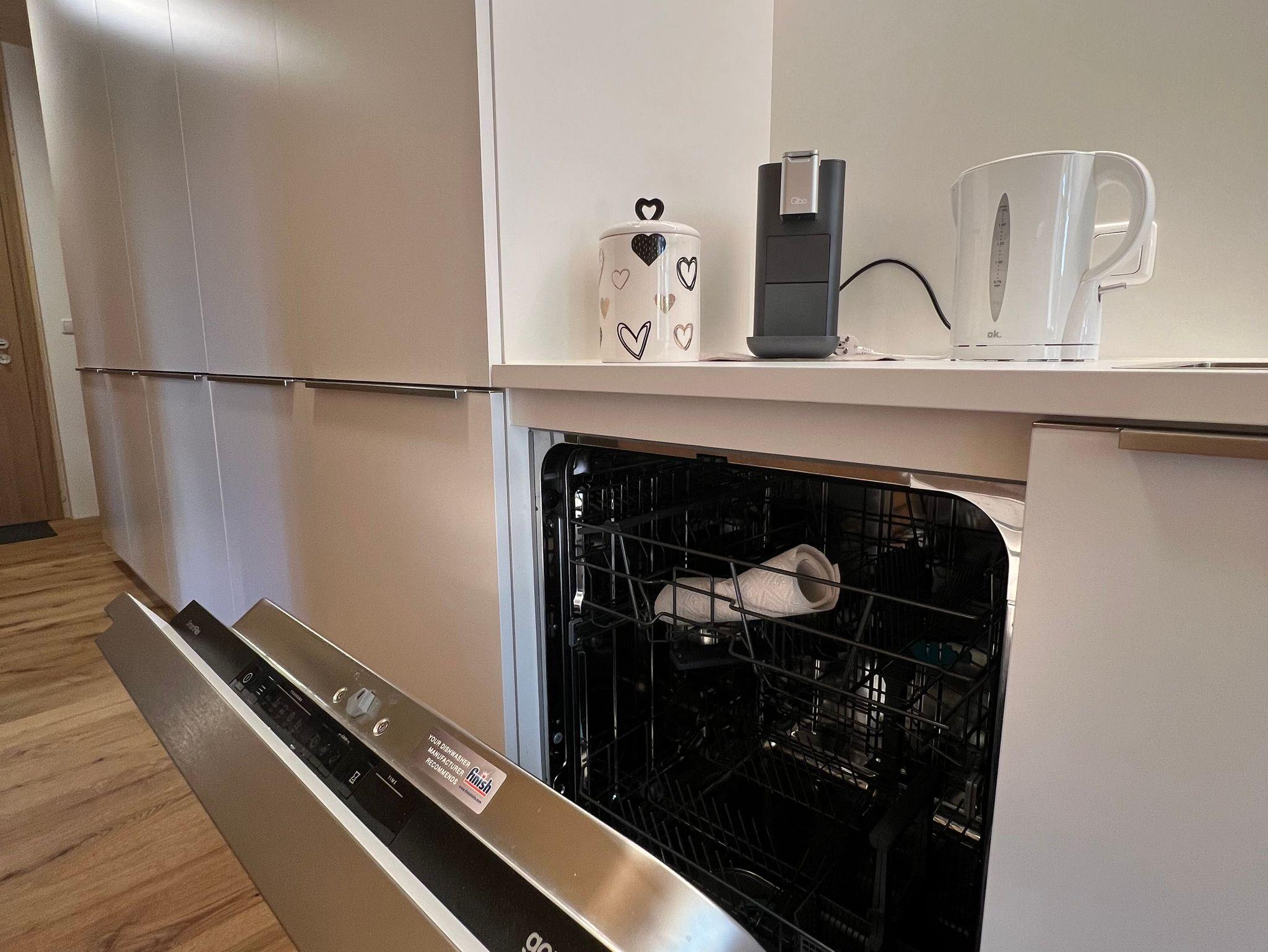 • Voll ausgestattete Küche mit Geschirrspüler, Herd und Backofen.