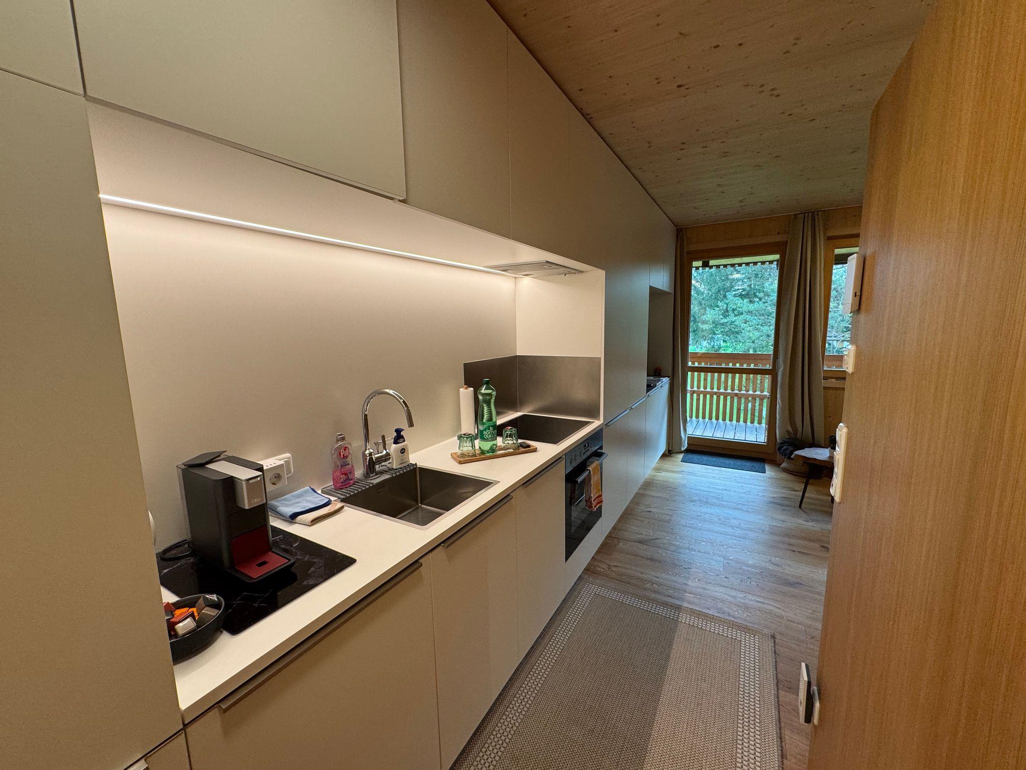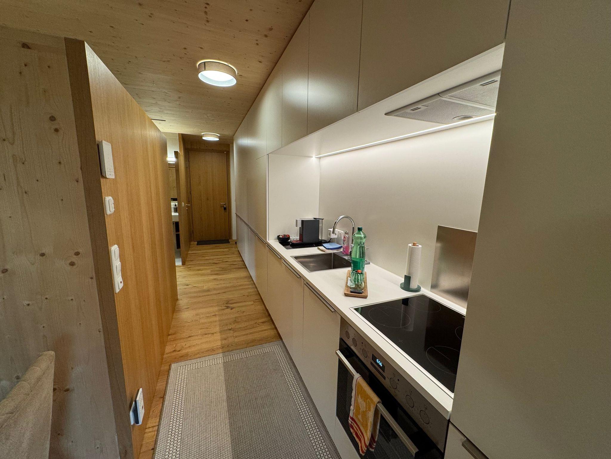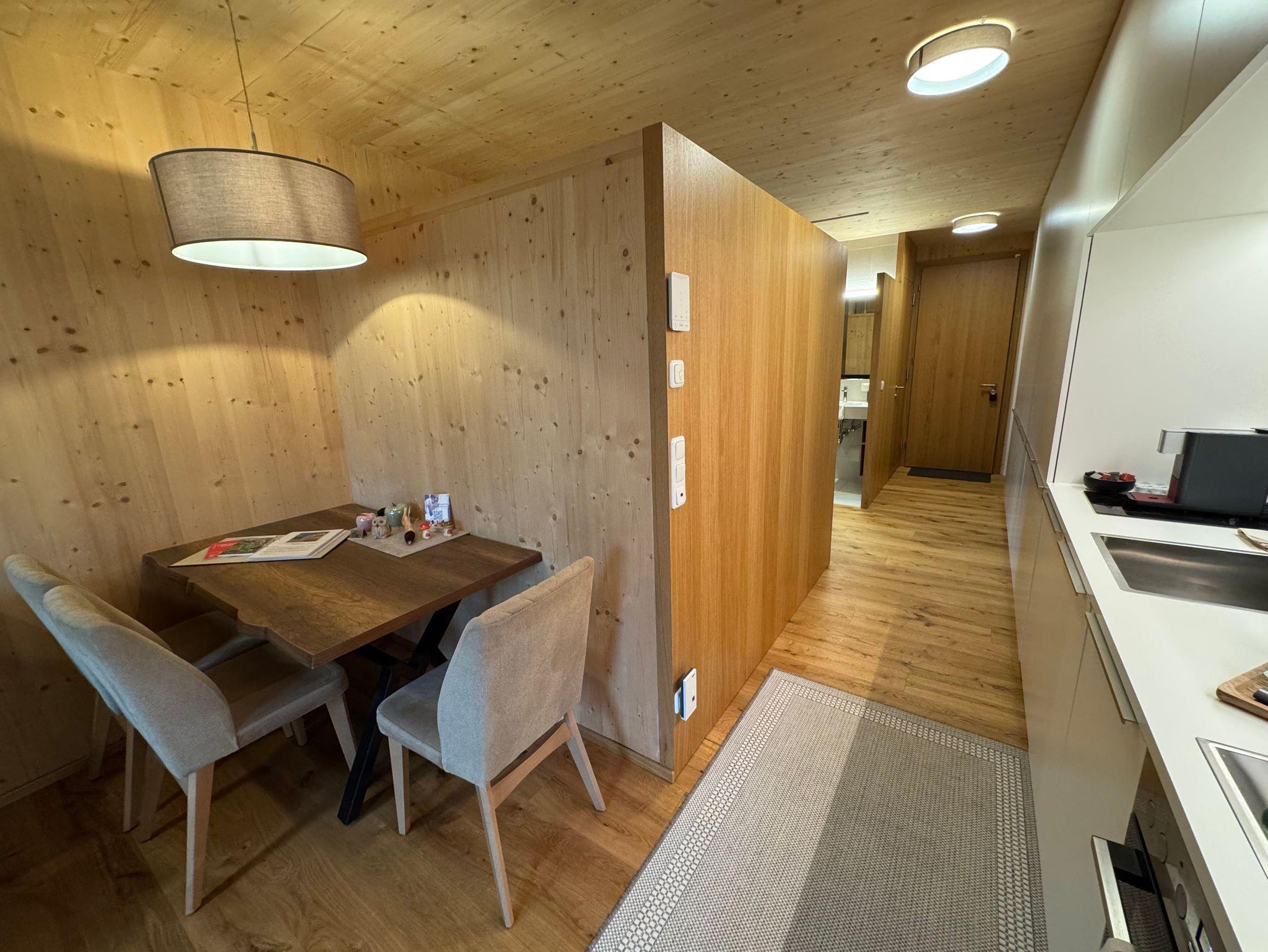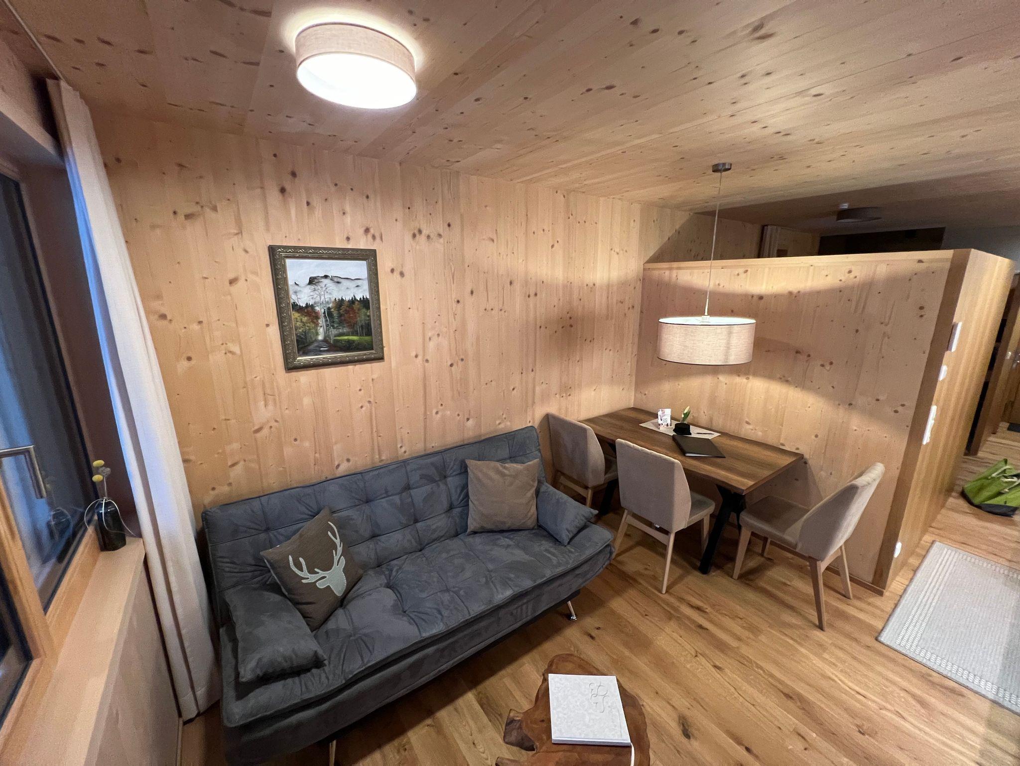 Das Wohnzimmer ist mit einem Sofa/Schlafsofa (Kann für eine dritte erwachsene Person oder bis zu zwei Kindern zum Schlafsofa umgewandelt werden, mit einer Liegefläche von 120x196 cm ), einem Flachbildfernseher, Radio und einem Esstisch ausgestattet. Die Küche ist modern und voll ausgestattet, einschließlich Geschirrspüler, Herd und Backofen. Das Schlafzimmer ist mit einem Doppelbett ausgestattet. Die Kombination aus offenem Bad mit ebenerdiger Dusche und Waschbecken und separatem WC ist eine praktische und komfortable Lösung für das Apartment Kanisfluh in Mellau.