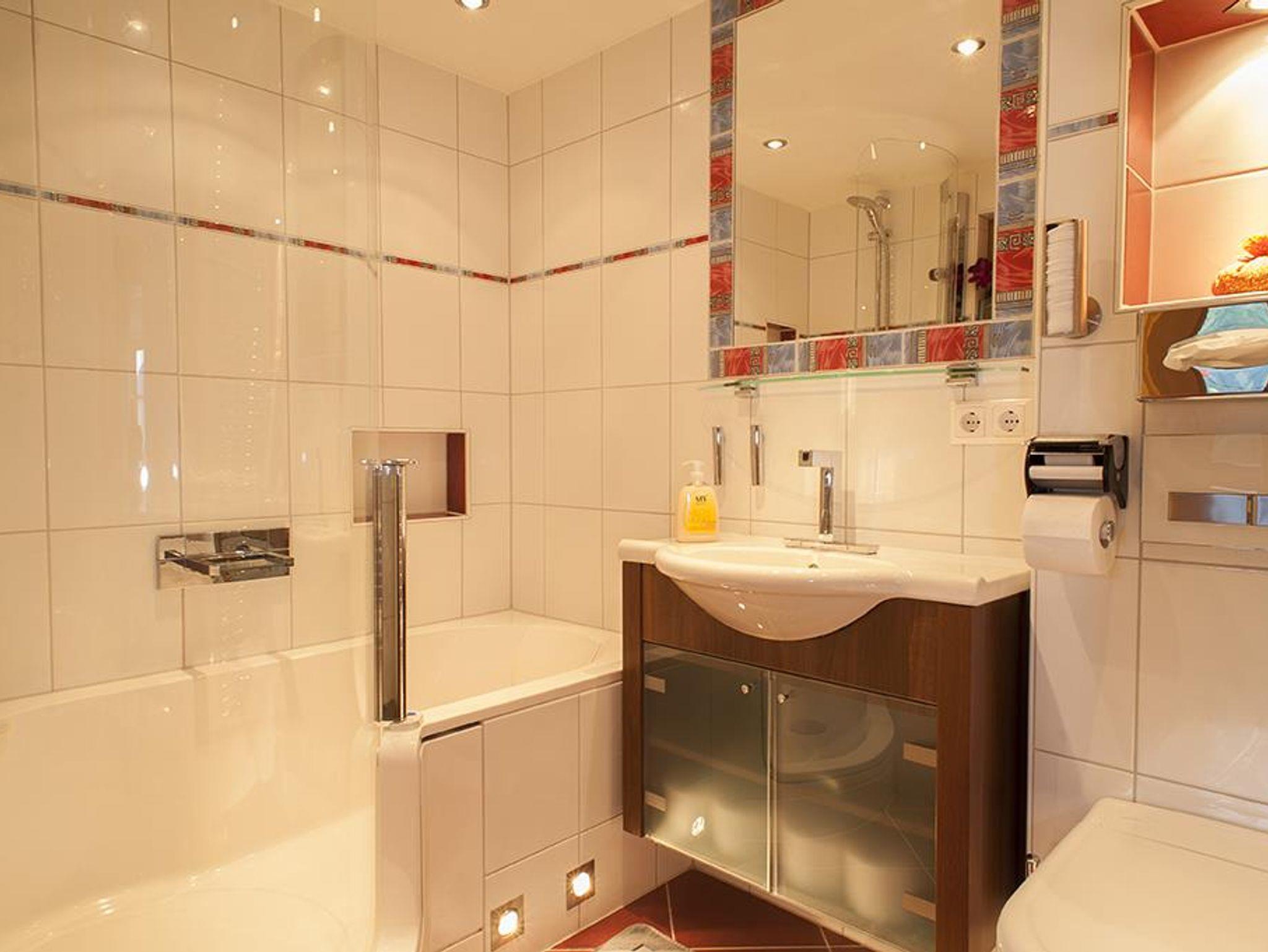 Das Schlafzimmer ist mit einem romantischen Doppelbett ausgestattet, das Bad mit gehobenem Standard: kombinierte Dusche / Badewanne, WC, Waschbecken, Heizkörper als Handtuchwärmer und außergewöhnliche Armaturen. Im Wellnessbereich Zirben- und Altholzsauna, Infrarotkabine.