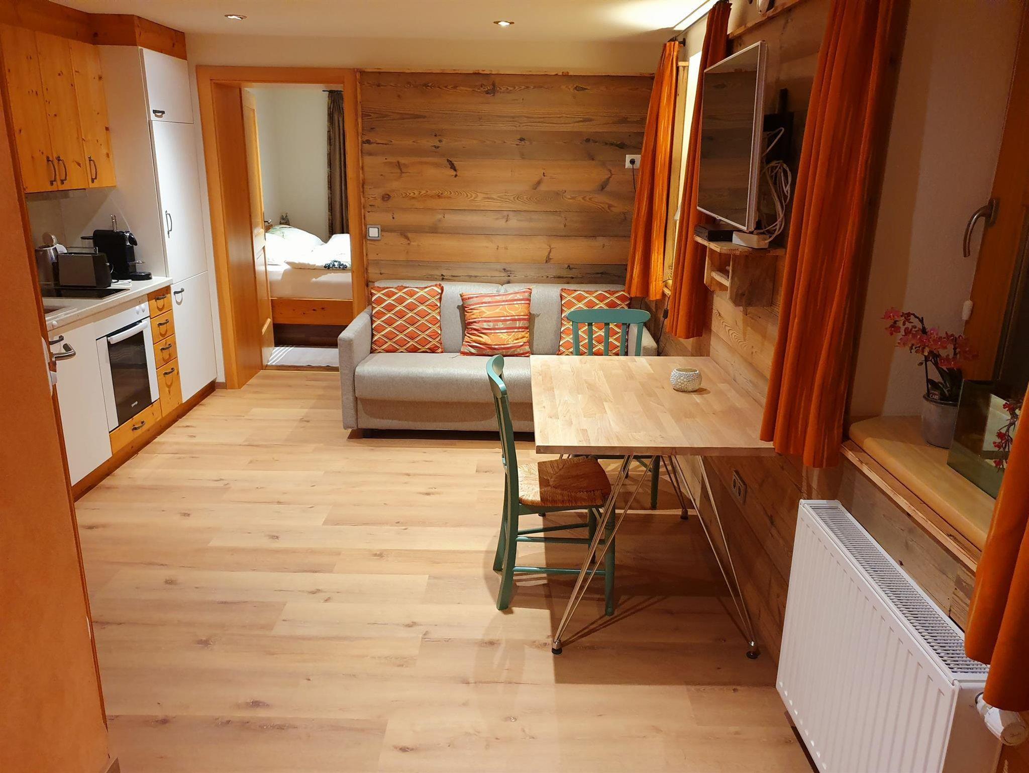 Unsere urige Ferienwohnung „Alpenrosen“ hat Platz für 4 Personen (33 qm) und einen direkten Zugang zur Terrasse. Der Wohn- und Essbereich mit integrierter offener Küche ist mit moderner Technik ausgestattet: In der Küche sind alle üblichen Elektrogeräte bis hin zum Nespresso-Kaffeeautomat vorhanden - im Wohnbereich ein 40 Flat-TV mit DVD Spieler, Internetradio etc. Das Schlafsofa bietet Platz für 2 Personen. Wellnessbereich mit Zirben- und Altholzsauna.