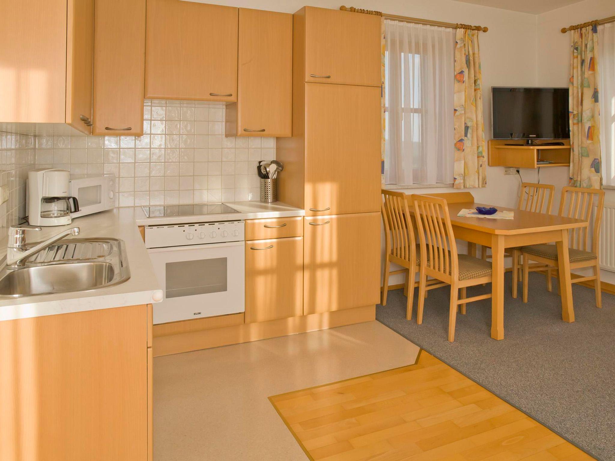 Alle Ferienwohnungen sind ausgestattet mit Küche (Kühlschrank, Mikrowelle, Herd, Geschirrspüler, Kaffeemaschine, Wasserkocher, Toaster), SAT-TV und Radio, Dusche/WC, Föhn und Balkon.