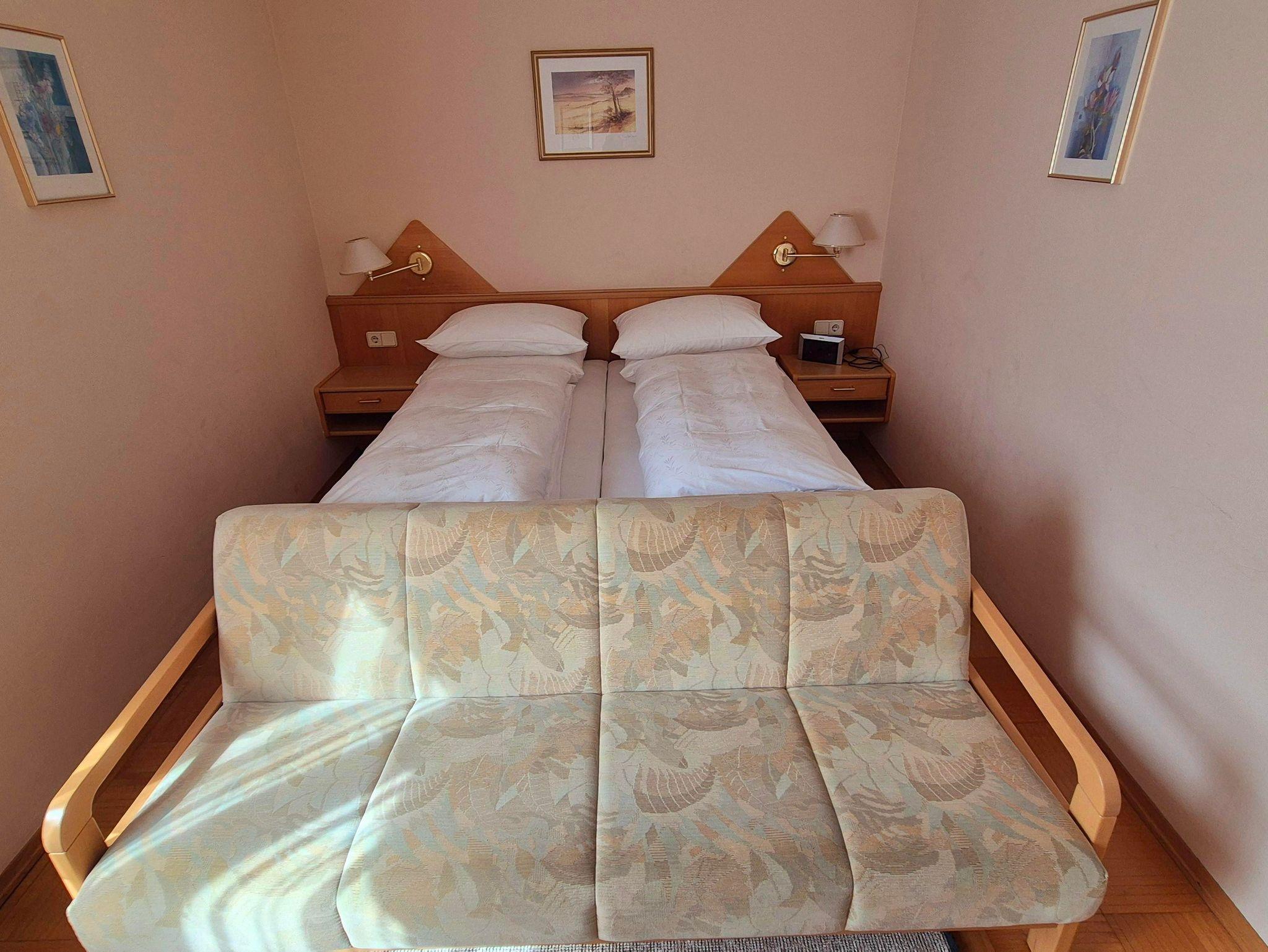 Die Wohnung ist ca. 55 m² groß und verfügt über ein Wohnzimmer mit Schlafcouch für 2 Personen, eine kleine separate Küche mit 2 Kochplatten, Kühlschrank, Geschirrspüler, Wasserkocher, Kaffeemaschine und Toaster, ein Schlafzimmer für 2 Personen und ein Bad/WC.