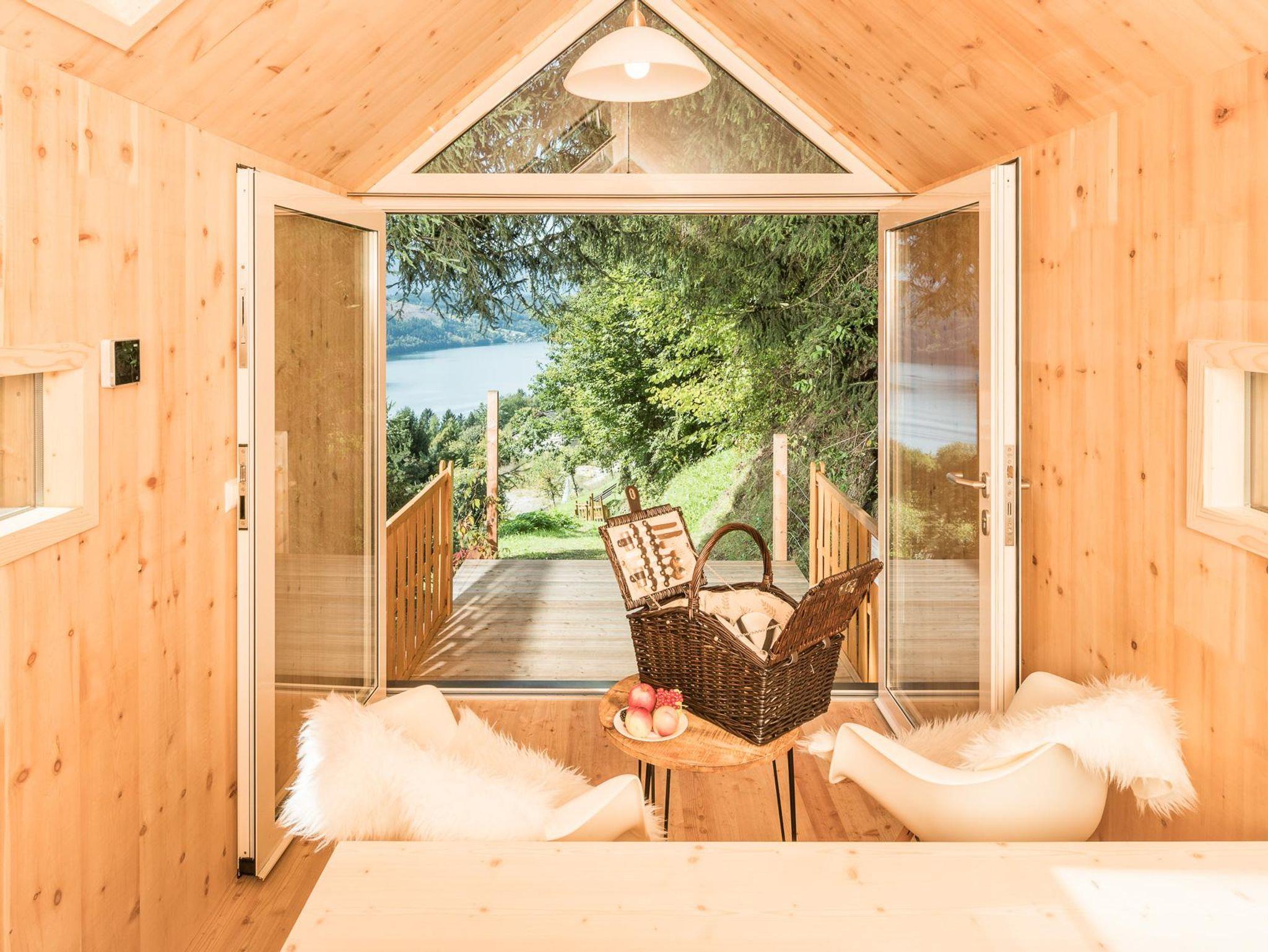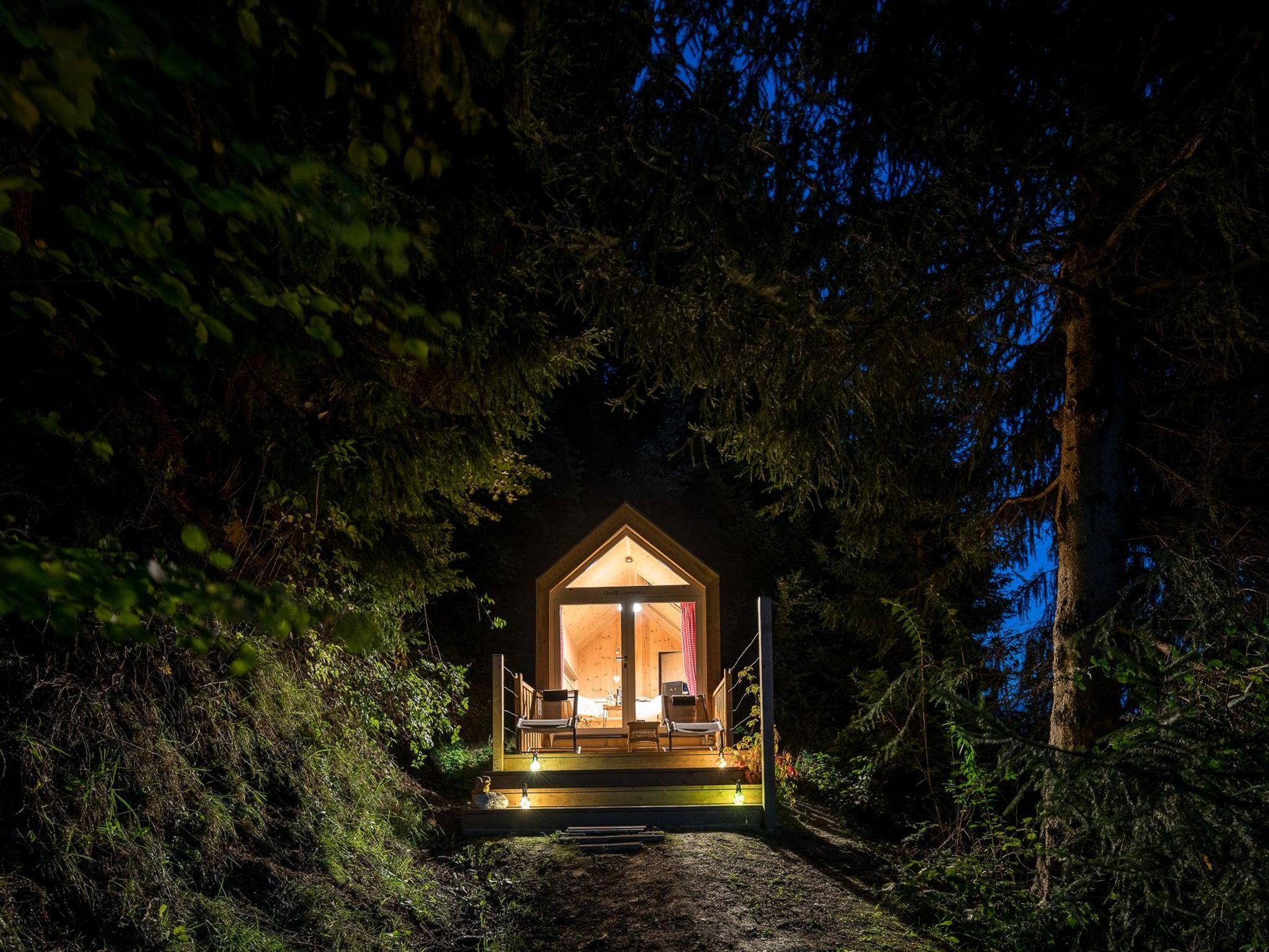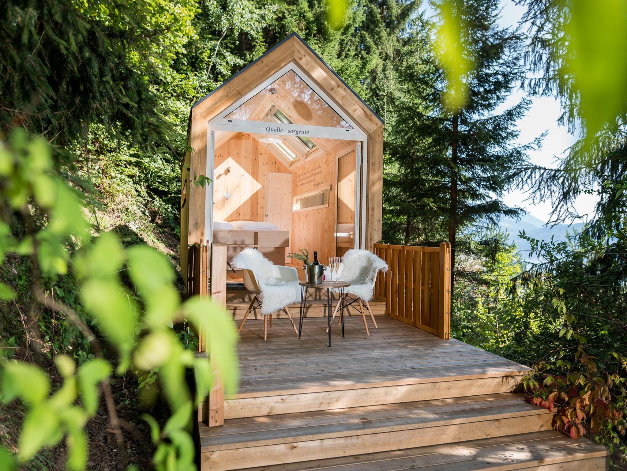 Durch die großzügigen Panoramafenster fällt der Blick abends auf die Sterne, morgens auf den Sonnenaufgang. Aus heimischem Lärchen-, Zirben und Fichtenholz gezimmert bietet das Biwak Platz für ein großes Bett, einen Tisch samt beschwingten Stühlen mit kuscheligem Lammfell sowie einen getrennt zugänglichen Waschraum mit WC und einer Waschschüssel aus Fluss-Stein. Mobilgeräte, Schlüssel und Terminkalender verstauen Sie in einem kleinen Fach, um die Zweisamkeit ganz ungestört zu erleben. Die Glasflügeltür öffnet sich zur Veranda hin, die zum Frühstücken Freien einlädt.