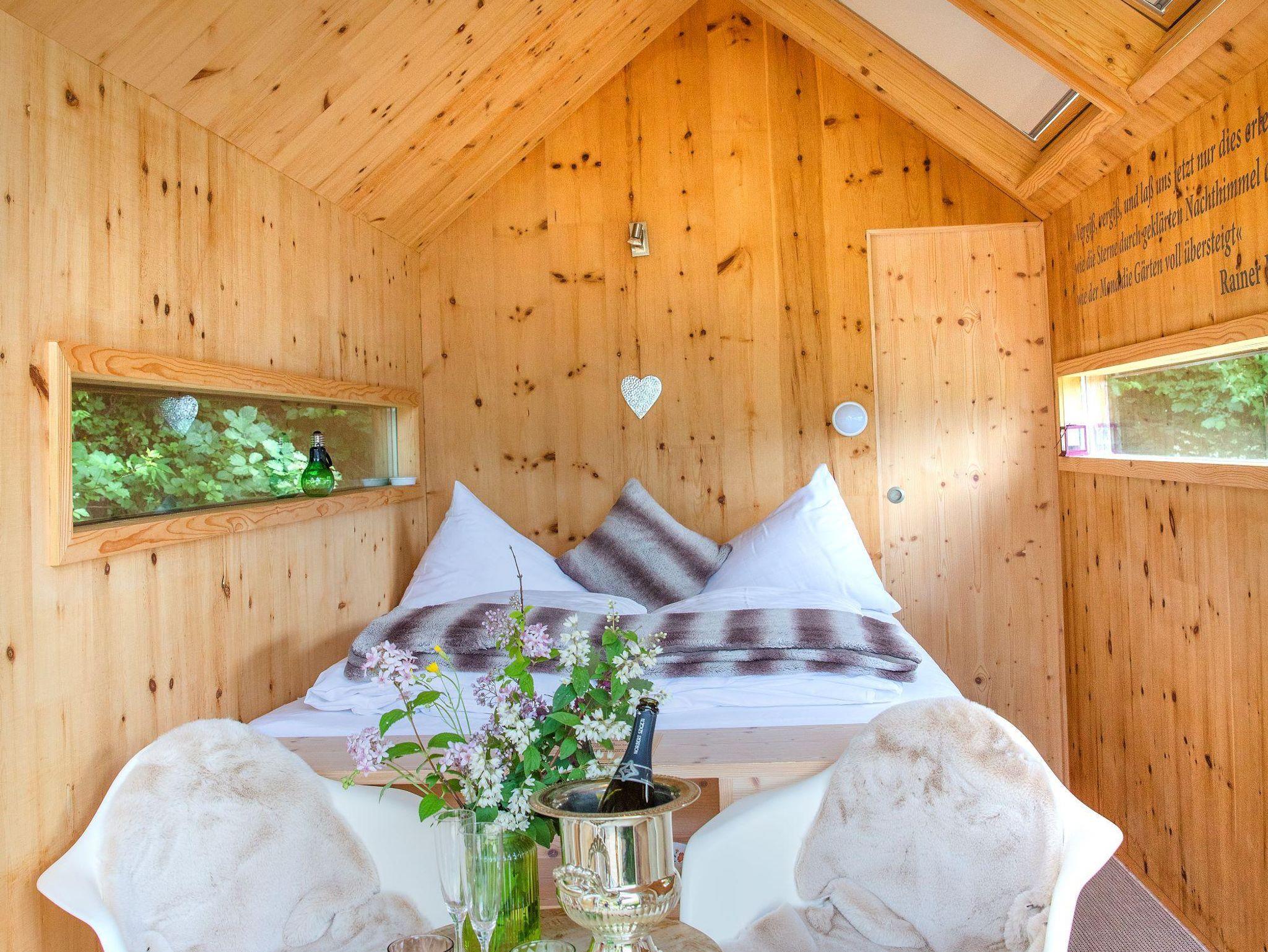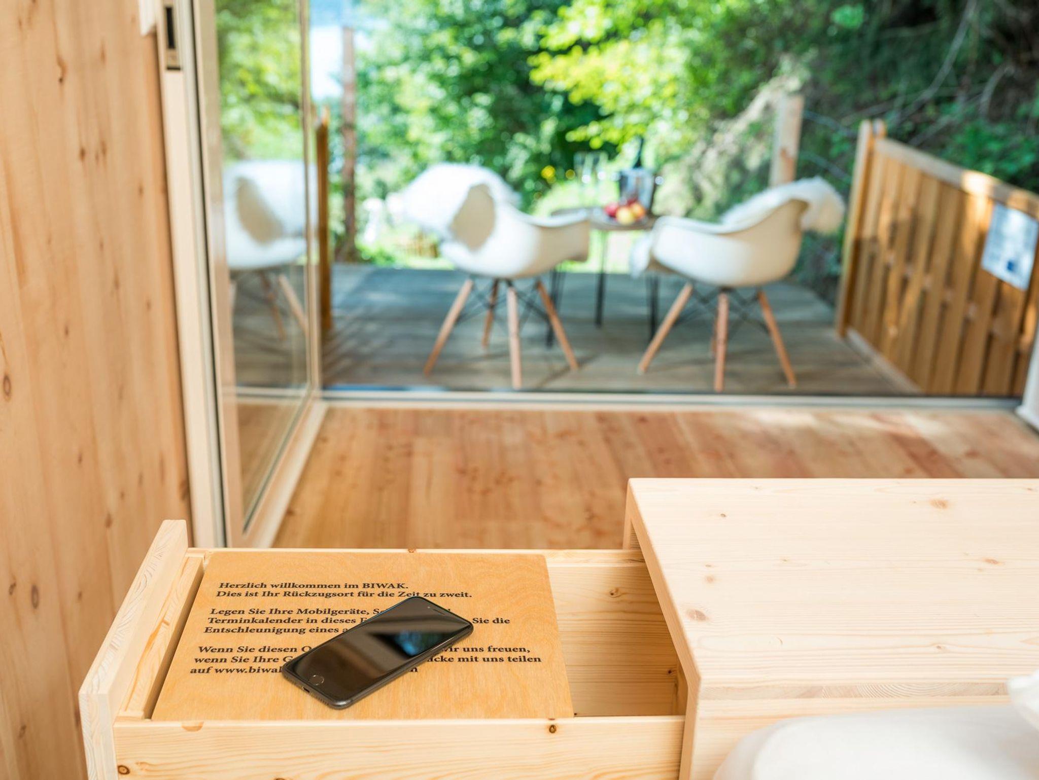 Durch die großzügigen Panoramafenster fällt der Blick abends auf die Sterne, morgens auf den Sonnenaufgang. Aus heimischem Lärchen-, Zirben und Fichtenholz gezimmert bietet das Biwak Platz für ein großes Bett, einen Tisch samt beschwingten Stühlen mit kuscheligem Lammfell sowie einen getrennt zugänglichen Waschraum mit WC und einer Waschschüssel aus Fluss-Stein - keine Dusche. Mobilgeräte, Schlüssel und Terminkalender verstauen Sie in einem kleinen Fach, um die Zweisamkeit ganz ungestört zu erleben.