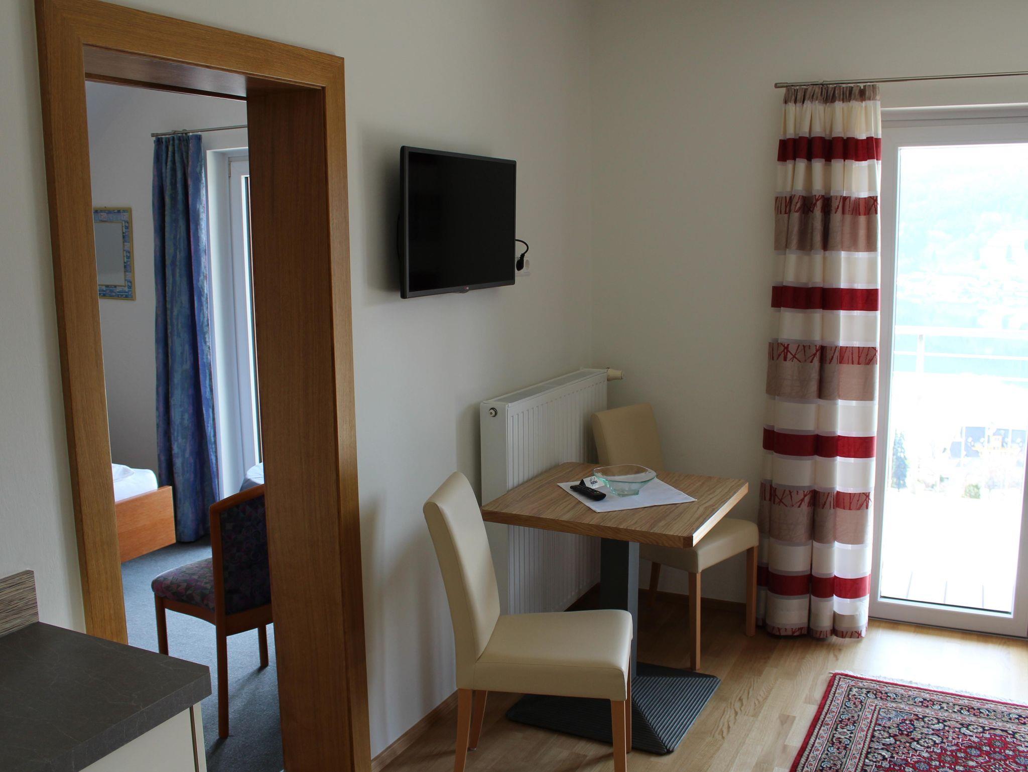 Von der Wohnküche und vom Schlafzimmer mit Doppelbett aus gelangen Sie direkt auf den großen südseitigen Balkon mit herrlichem Blick auf den Millstätter See, die Berge und den historischen Ort Millstatt.