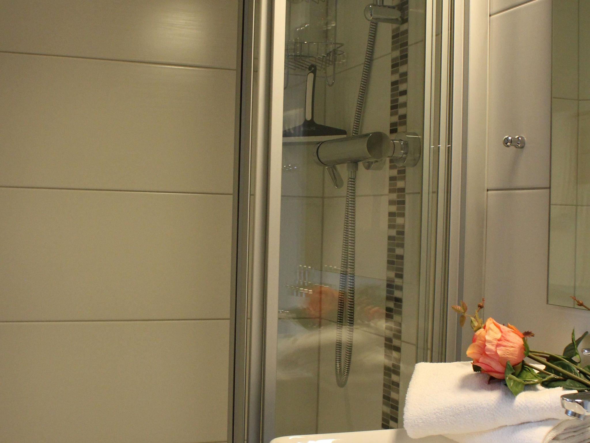 Das Badezimmer ist komplett neu, mit Dusche/WC, Waschbecken, Vergrößerungsspiegel und Föhn.