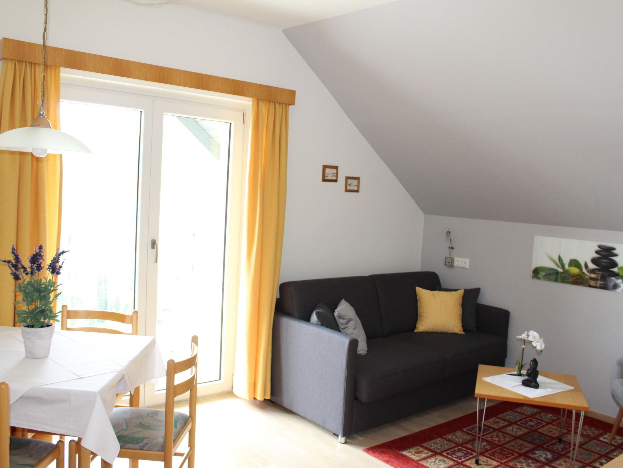 Ferienwohnung für 2 Personen mit 1 Schlafzimmer, 1 Wohnzimmer, Dusche/WC, voll eingerichtete Kochnische, Vorraum, WC extra, Radio, Sat-TV, großzügigen Balkon nach Süden mit Blick auf den See, den Ort Millstatt und die Berge.