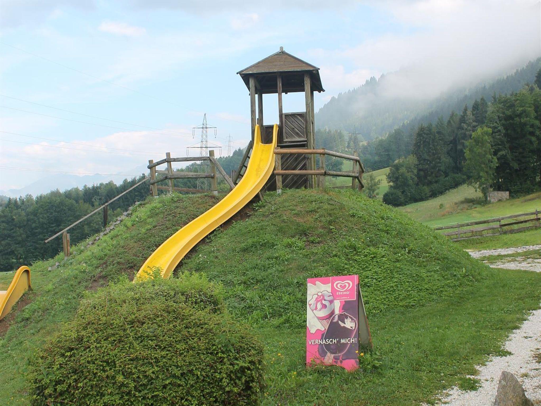 Kinder freuen sich über den tollen Spielplatz mit mehreren Spielgeräten. Sie finden genügend Platz zum Fußball spielen und Herumtoben.