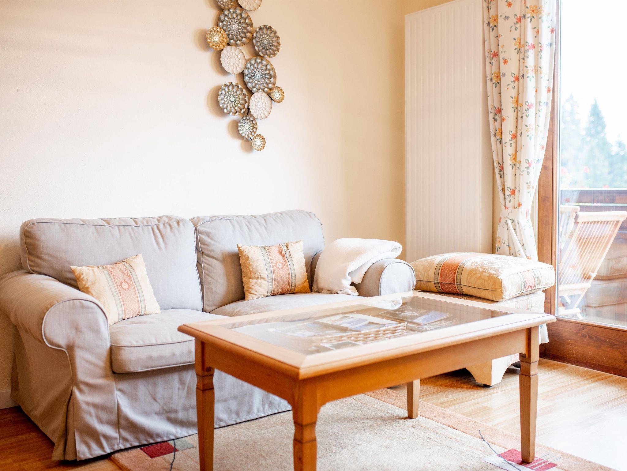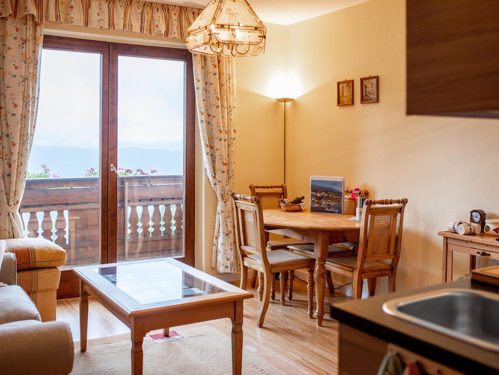 Geräumiges Appartement mit Seeblick. Wohnzimmer mit Küche und Essecke, Tür zum großen Balkon. Beide Schlafzimmer mit einem Balkon.