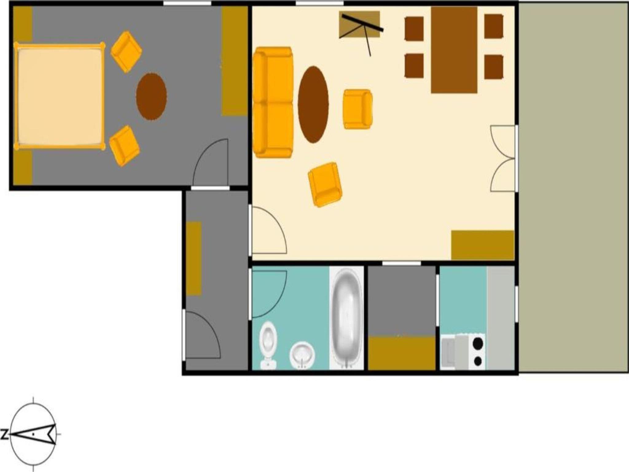Die Wohnung ist ca. 53 m² groß und verfügt über ein Wohnzimmer, ein separates Schlafzimmer (für 2 Personen), eine kleine separate Küche mit 2 Kochplatten, Kühlschrank, Geschirrspüler, Wasserkocher, Kaffeemaschine und Toaster, sowie ein Bad/WC.