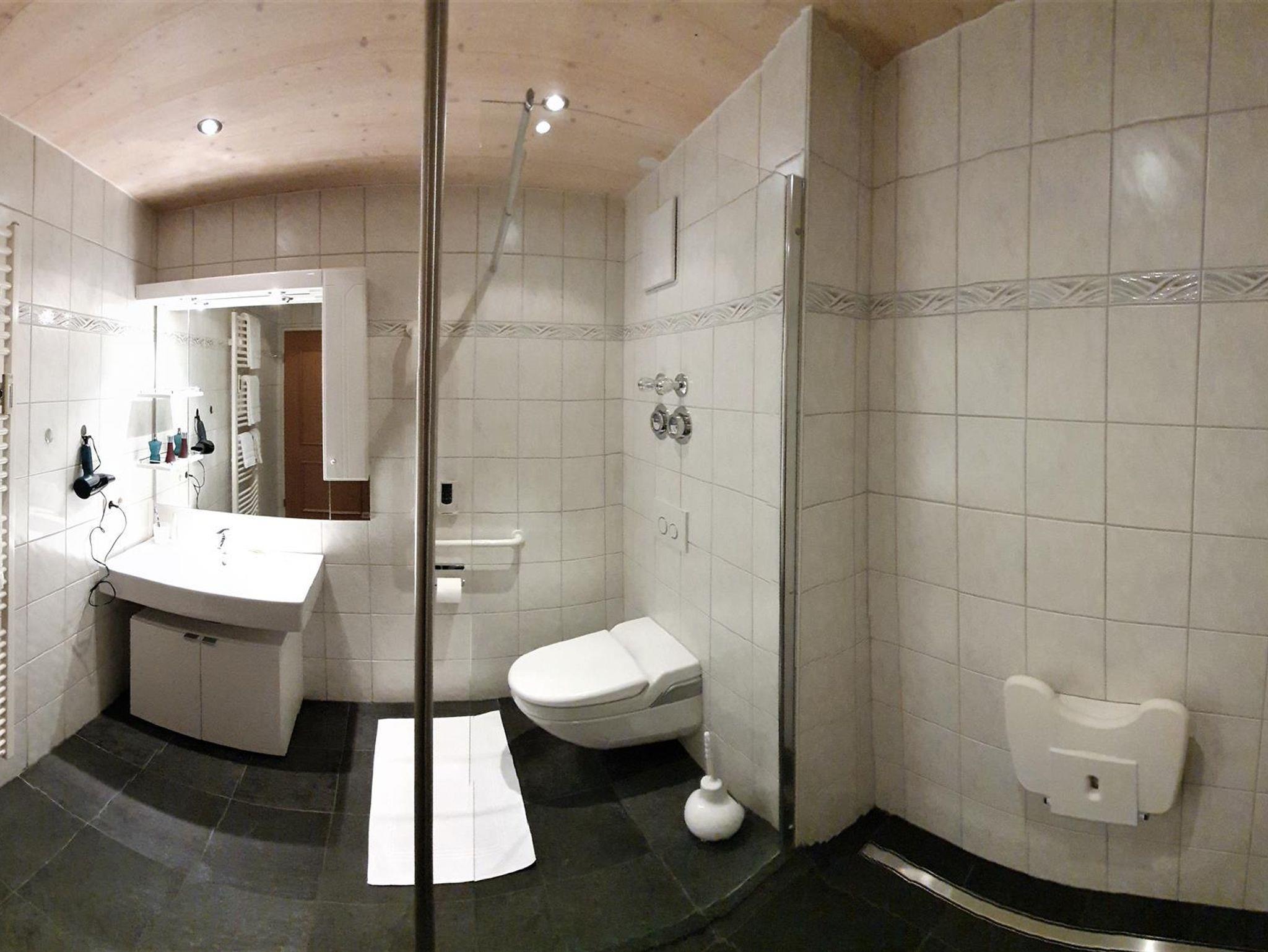 * breite bodenebene Dusche, automatisches WC, Waschbecken
