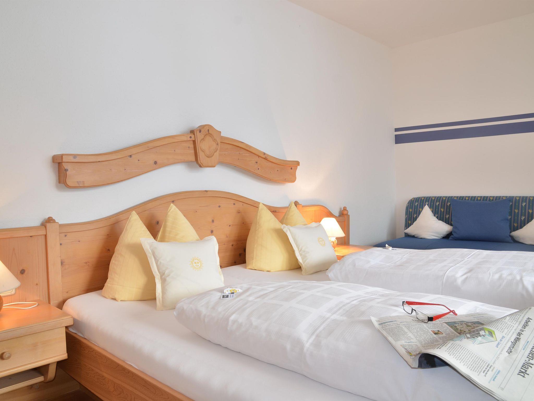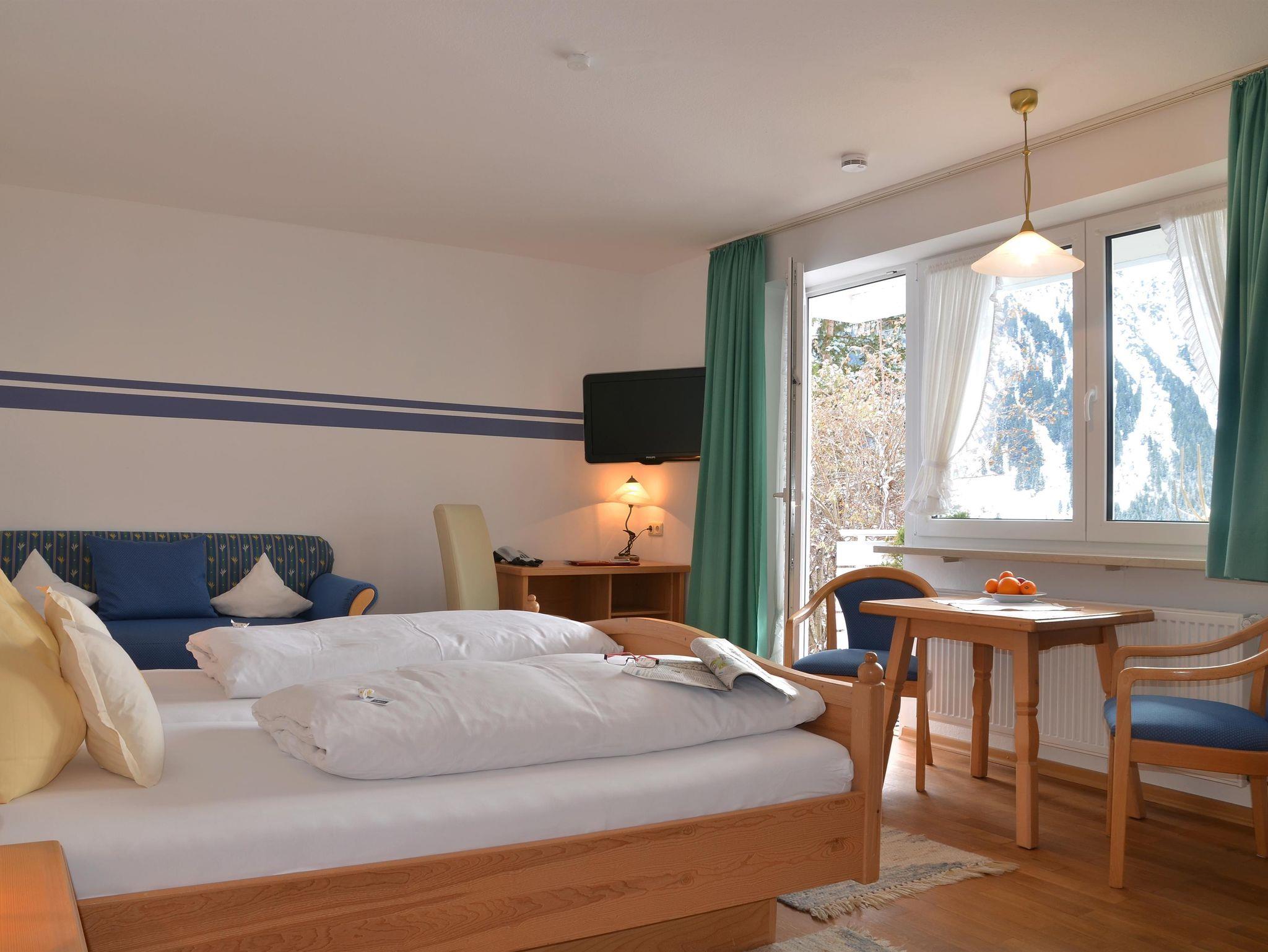 Doppelzimmer mit Doppelbett, Couch, Sitzecke, Schreibtisch, Kühlschrank,digitalisiertem Flachbildschirm, Telefon und Radio. Garderobenvorraum mit Schrank und Safe, Badezimmer mit Dusche/WC, Fön. Süd-Balkon mit grandioser Bergpanorama-Sicht oder Sonnen-Terrasse mit grandiosem Berg-Panoramablick, Liegewiese, Liegestühle und diverse Sitzgelegenheiten