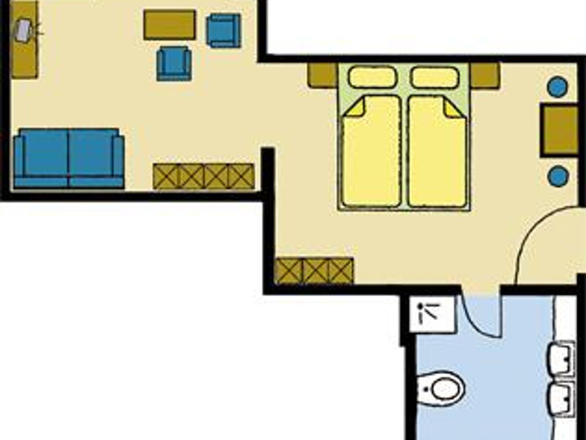 Unsere Familienzimmer Zirkon mit ca. 38qm verfügt über Elternschlafzimmer, Wohnzimmer mit einer Doppelcouch zum ausziehen, Dusche, Doppelwaschbecken und WC. Dieses Zimmer verfügt über keine Küche