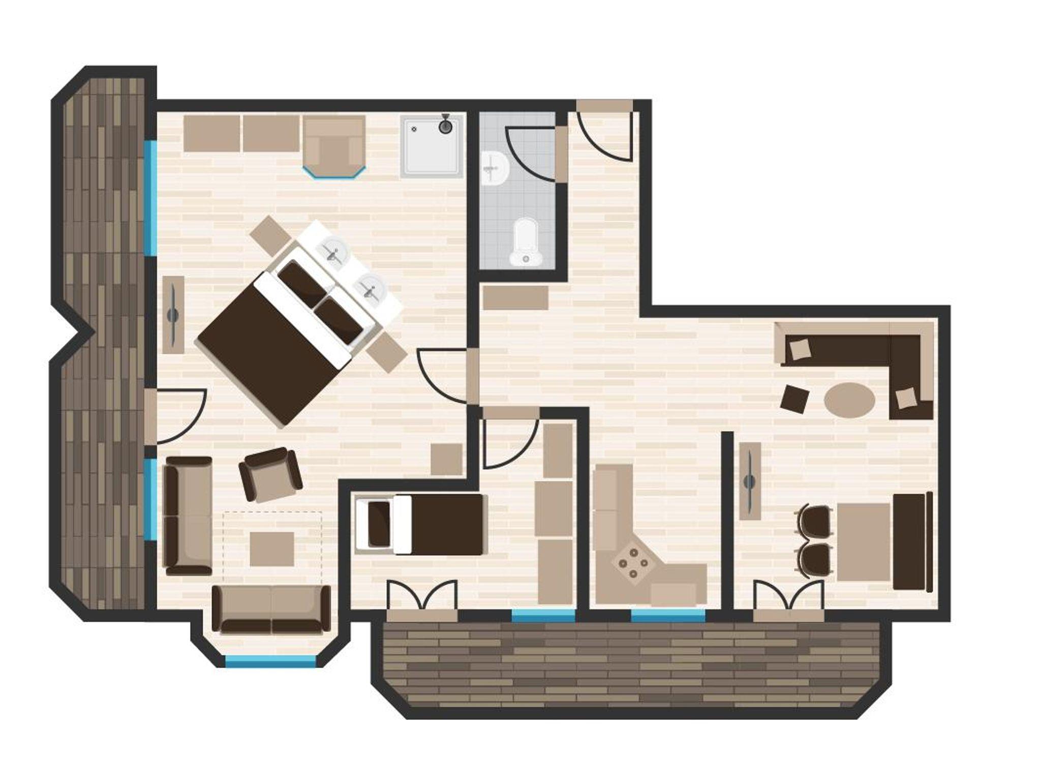 Unser Apartment Diamant mit ca. 70 qm. verfügt über Elternschlafzimmer, Kinderzimmer mit Stockbett, L-Küche mit großen Kühlschrank, 4er Ceranfeld, Mikro/Backofenkombination, Voll ausgestattet, Sitzecke, Badezimmer mit begehbarer Dusche, Doppelwaschbecken, Infrarotkabine, WC separat, große Flachbildfernseher, WIFI Hotspot, sehr große Balkone mit Süd-West bzw. Nord-Ostausrichtung.