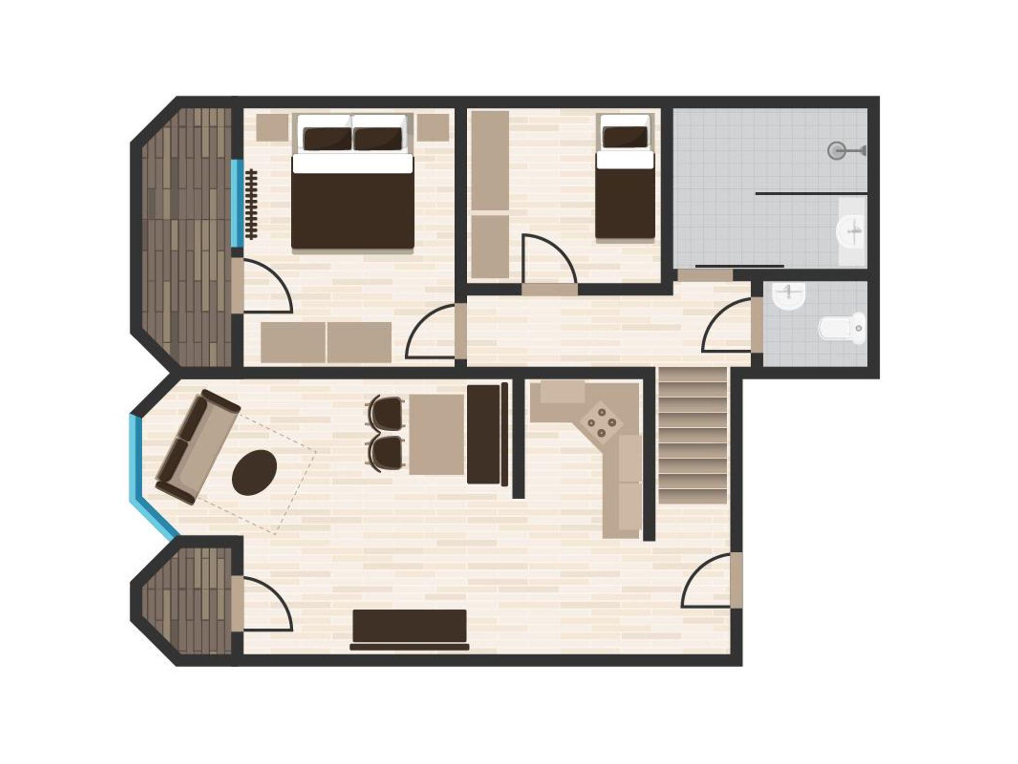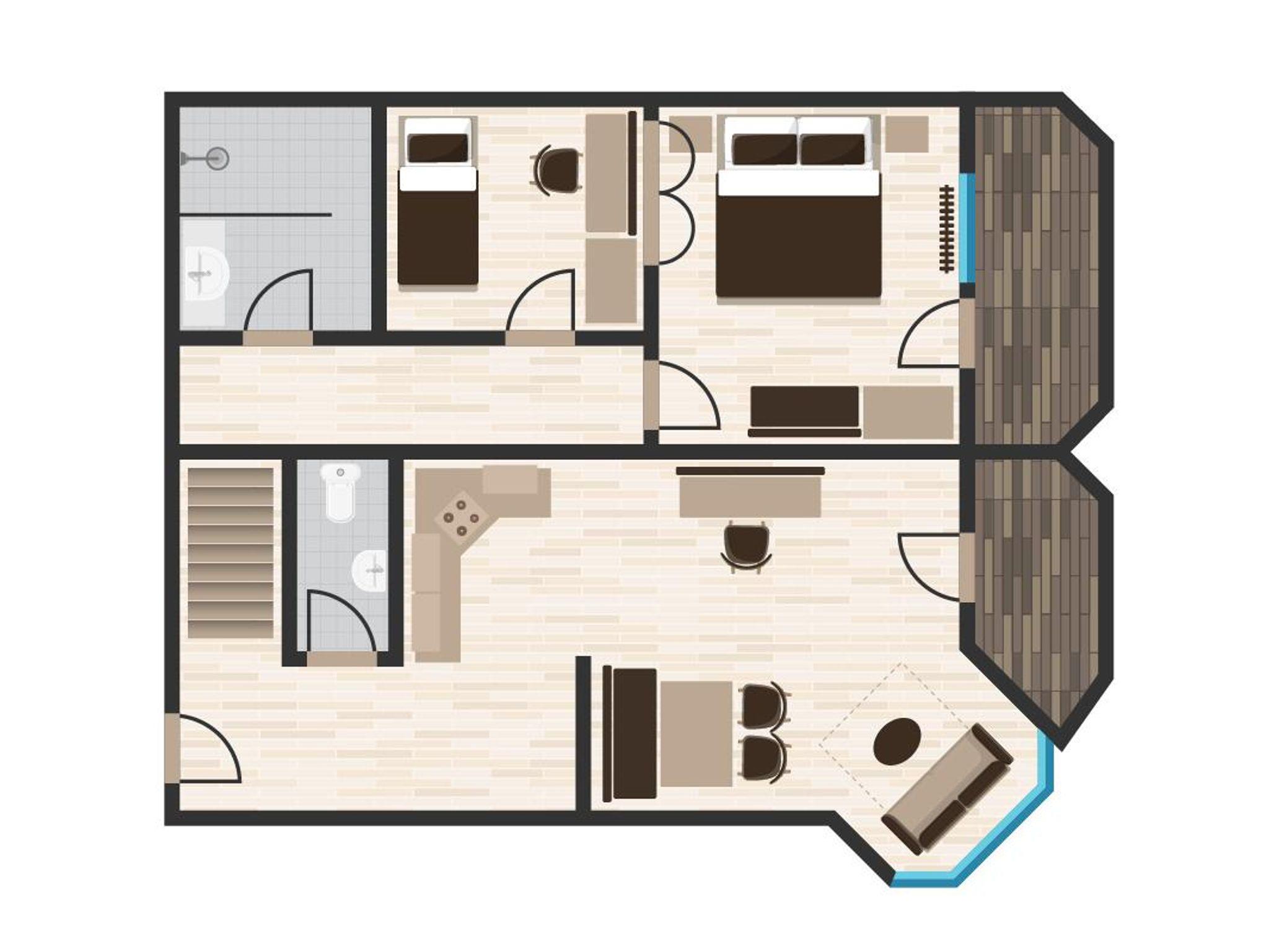 Unsere 6 Apartments Opal mit ca. 60 qm verfügen über Elternschlafzimmer, Kinderzimmer mit Stockbett, L-Küche mit großen Kühlschrank, 4er Ceranfeld, Mikro/Backofenkombination, Voll ausgestattet, Sitzecke, Badezimmer mit begehbarer Dusche, Waschbecken, WC separat, große Flachbildfernseher, WIFI Hotspot, Balkone bzw. Terrassen mit Süd-West bzw. Nord-Ostausrichtung.