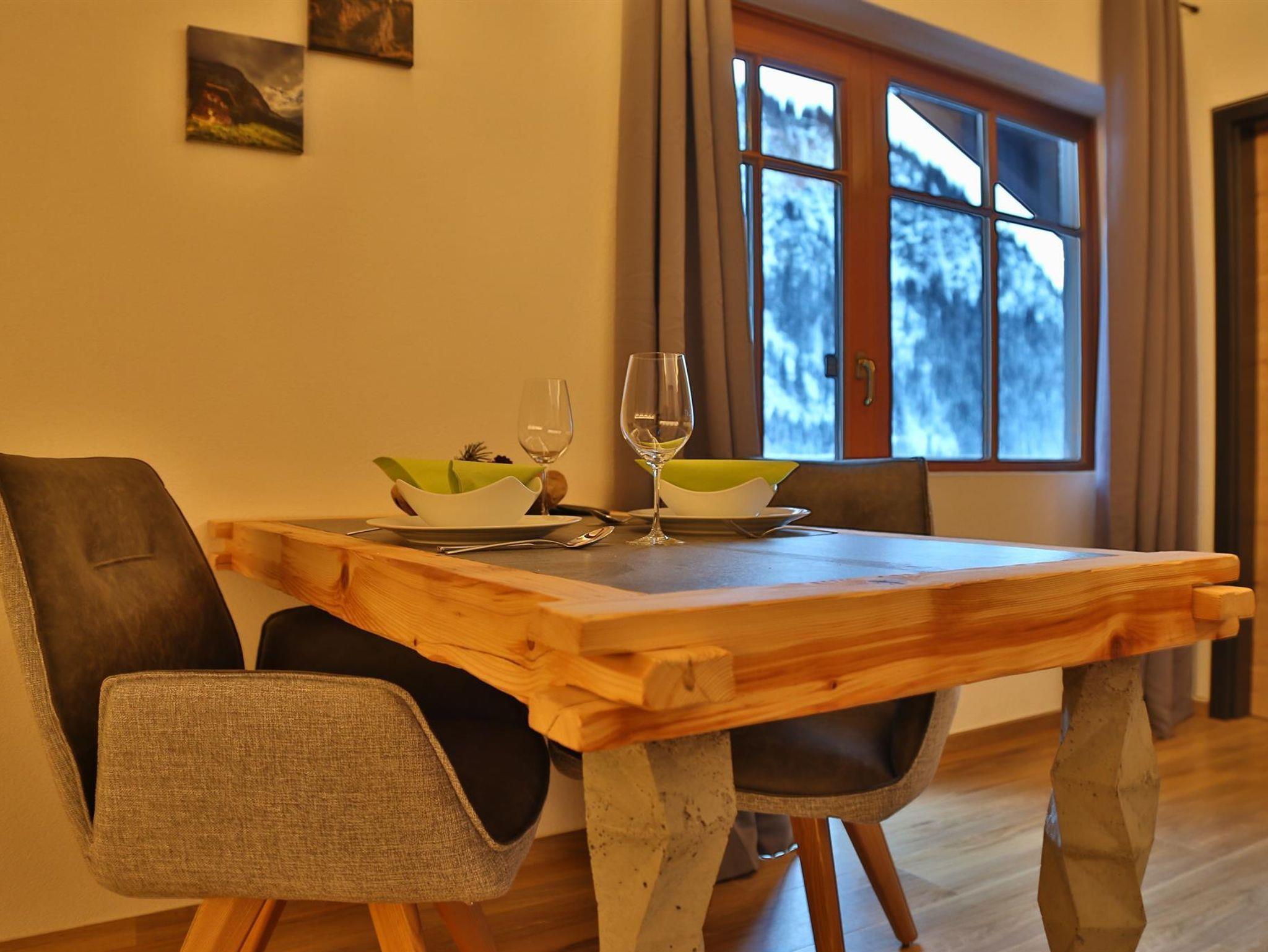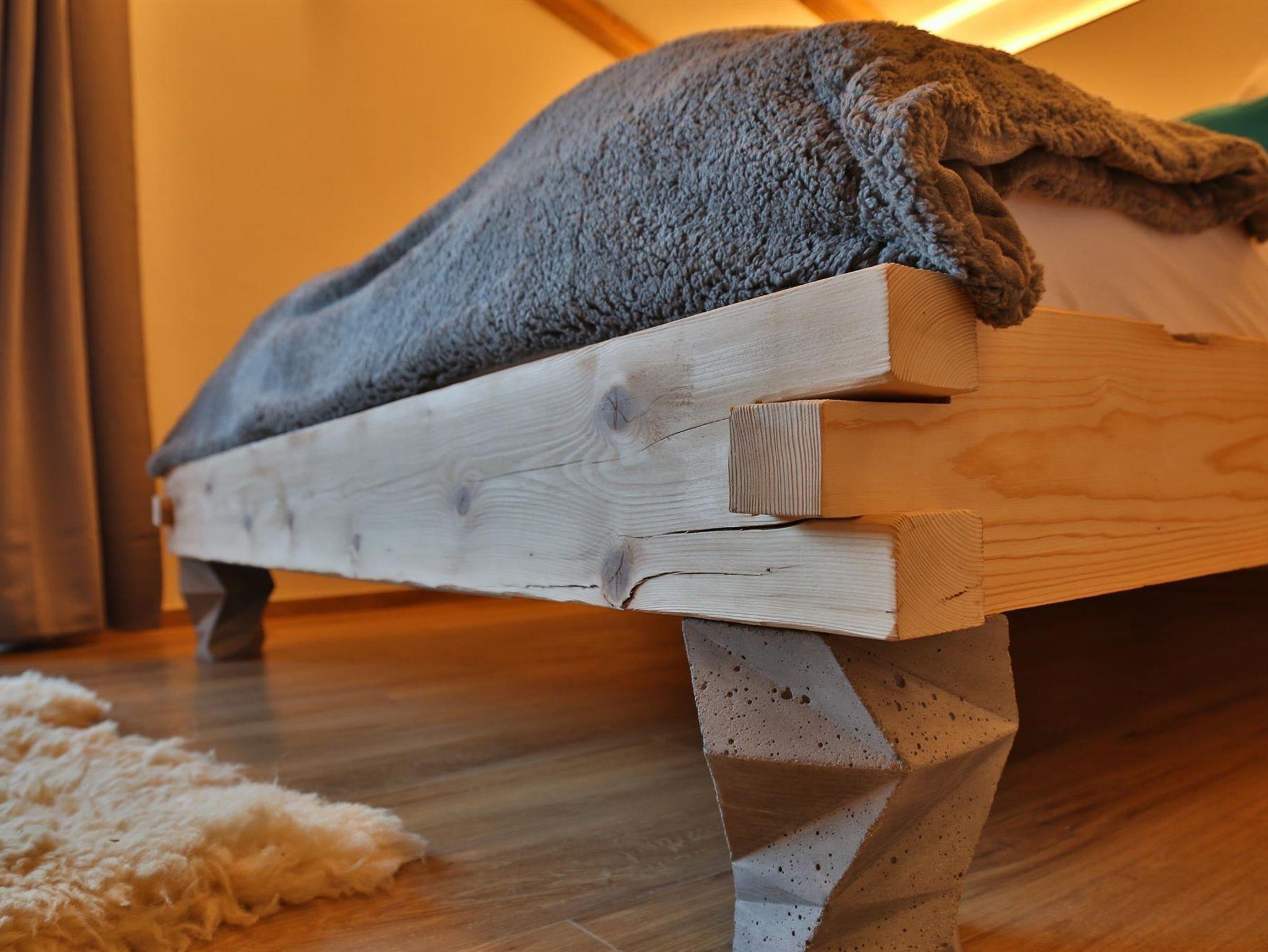 Auch hier sind Bett, Esstisch, sowie noch andere Ausstattungselemente Einzelstücke und wurden aus dem beim Abriss freigelegten alten Holz angefertigt.