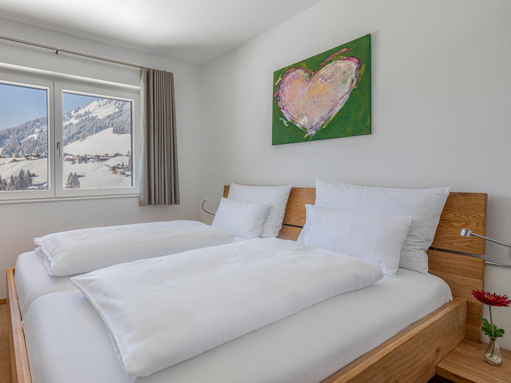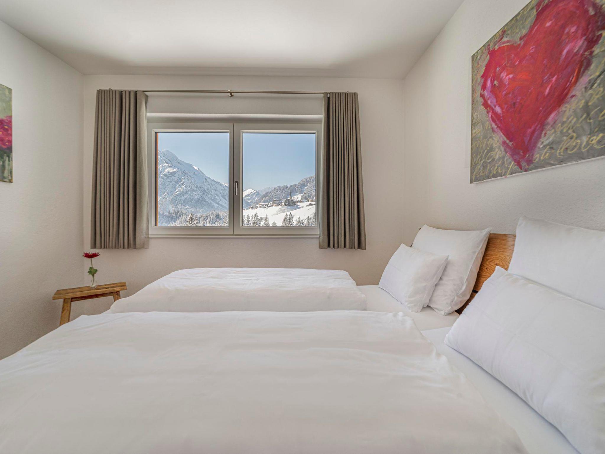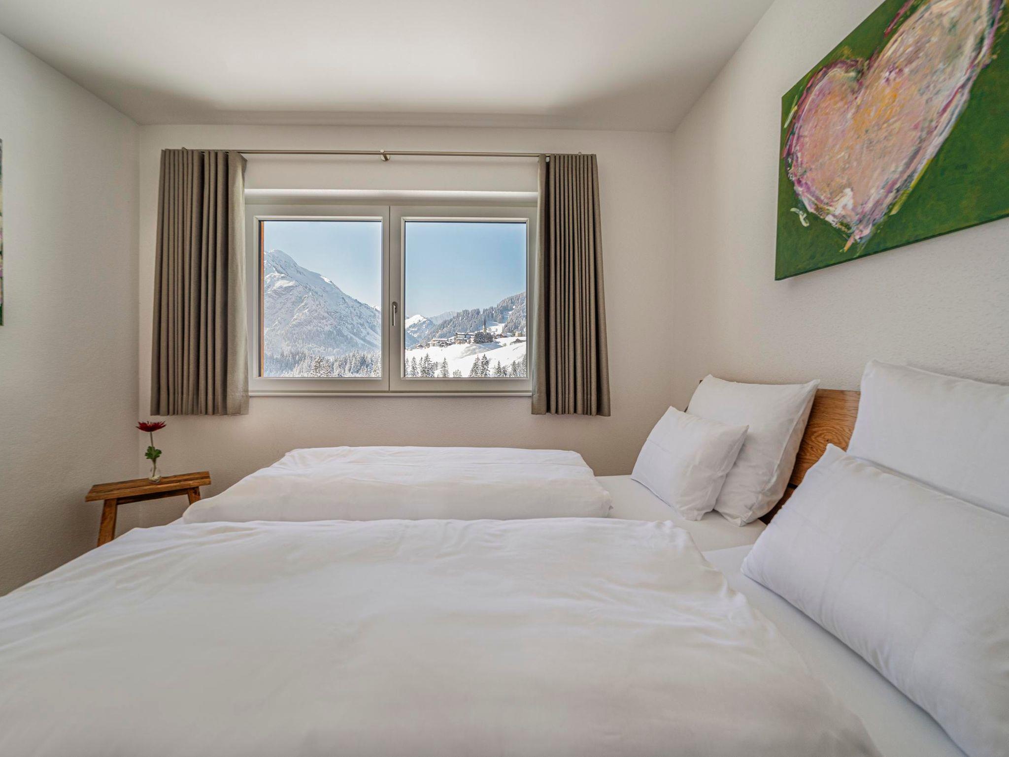 Die Ferienwohnung Zwölferkopf liegt im DG der Walser Lodge und lädt Sie ein, im hellen Wohn-/Küchen-/Essbereich mit den bodentiefen Fenstern das atemberaubende Bergpanorama zu genießen. Der große Eckbalkon davor lädt zum Sonnenbaden ein. Genießen Sie die hochwertigen fußrandlosen Doppelbetten mit extralangen Deckbetten (220 cm). Es gibt ein modernes Bad mit Dusche, WC und Doppelwaschbecken, dazu noch ein separates WC. Entspannen Sie im Saunabereich mit schönem Panorama-Ruheraum!