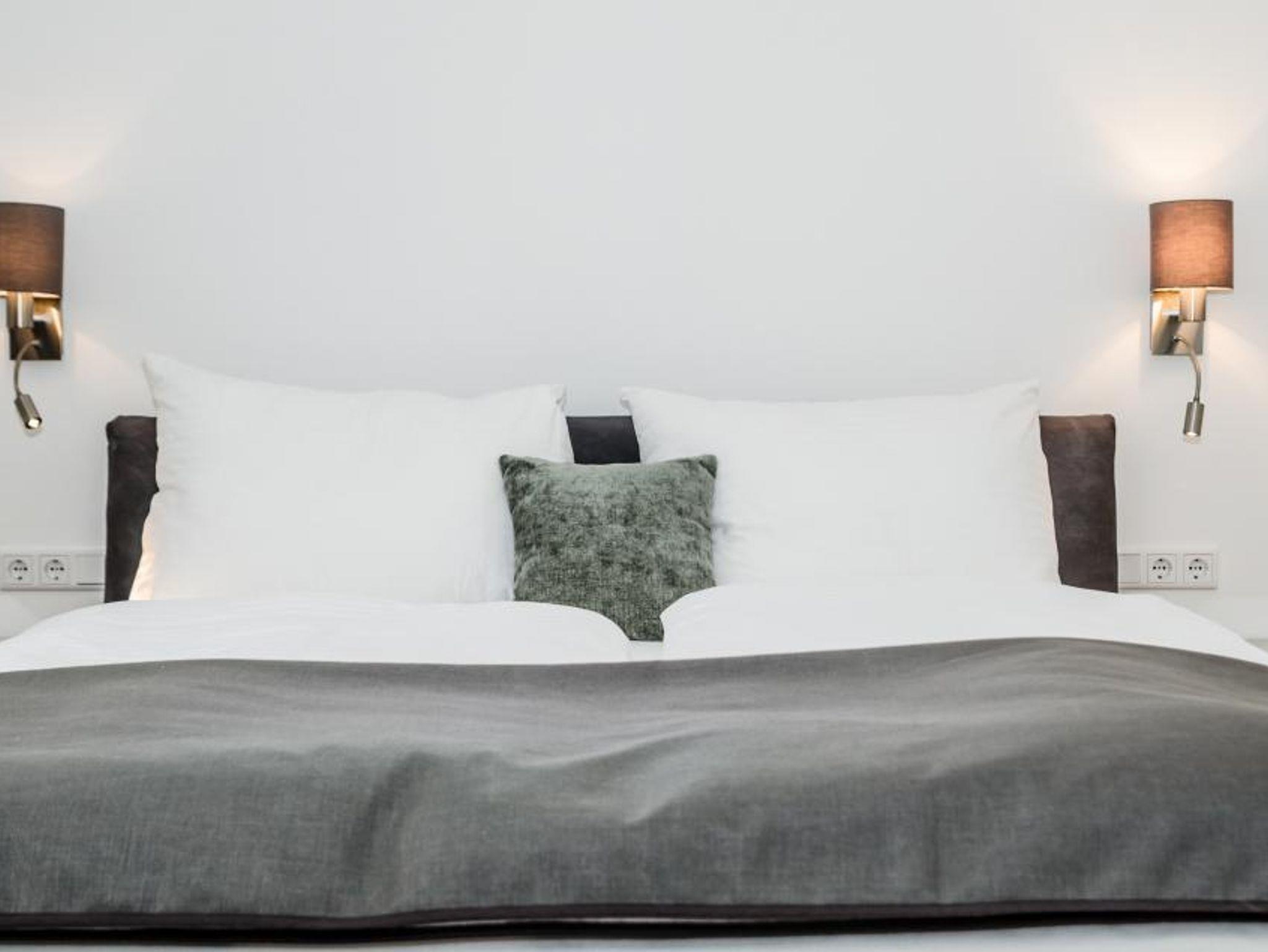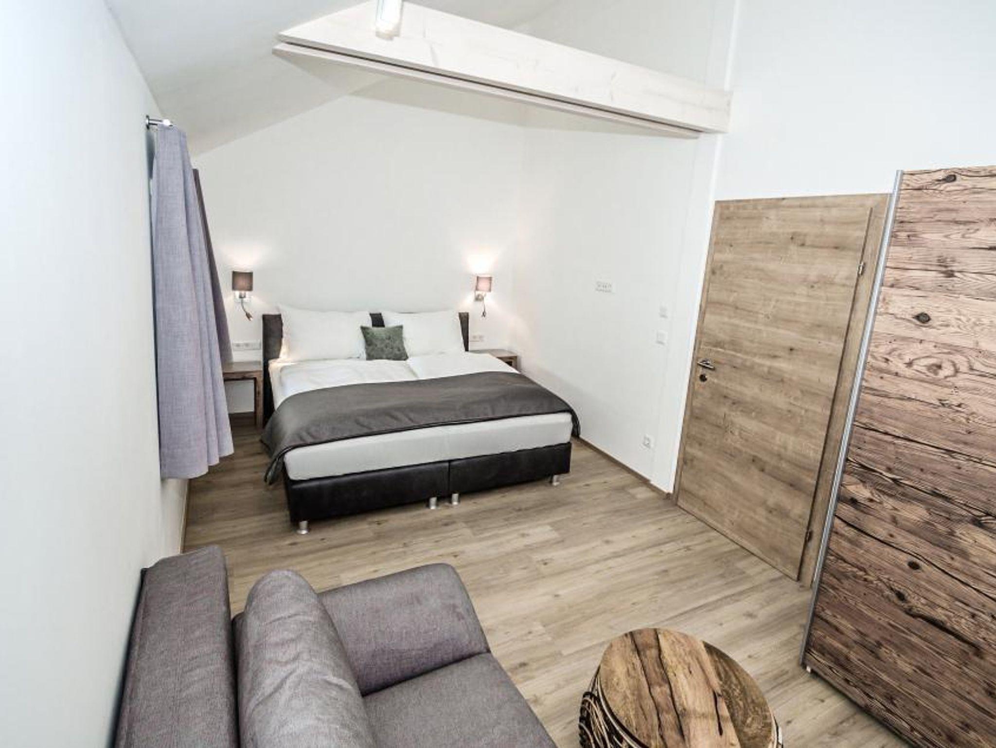 1 Schlafzimmer mit Boxspringbett und Doppelcouch