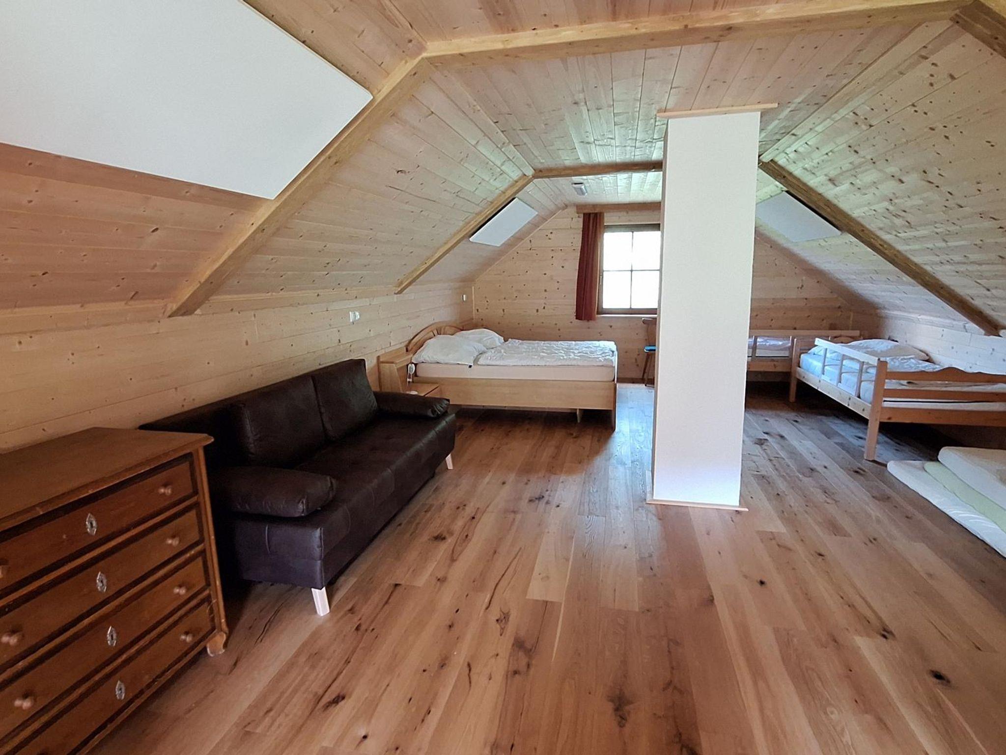 Obergeschoss: 1 großer Raum mit Doppelbett, 2 Kinder-Betten, Doppelcouch, Schreibtisch, Lesesessel, Infrarot - Paneele