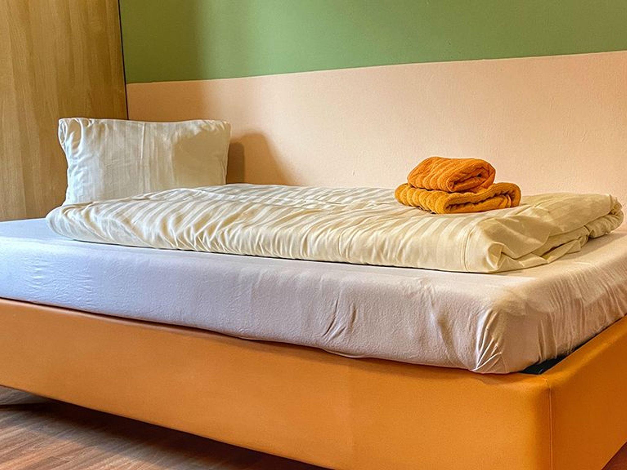 Das Dreibettzimmer verfügt außer, einen gemütlichen Schlafbereich, über eine Küche mit Geschirrspüler, Ofen, Kühlschrank, Geschirr und Abwasch. Es liegt im Erdgeschoss und das Fenster ist nördlich Richtung Bach ausgerichtet.