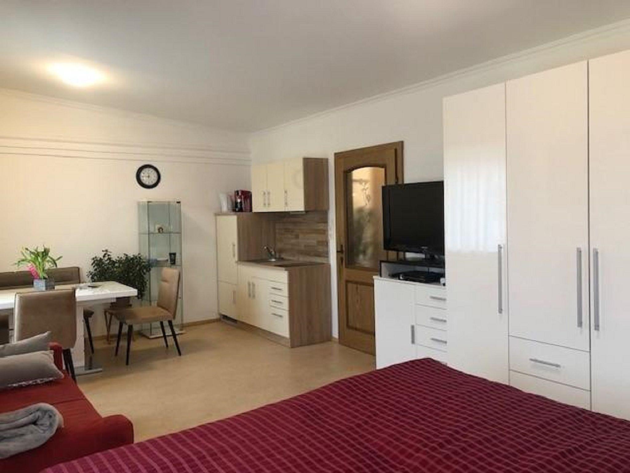 Die ruhig gelegene Ferienwohnung (mit eigenem Eingang) befindet sich angrenzend an das Wohnhaus der Familie Böhm. Durch den Garten mit Terrasse gelangen Sie, über ein paar Stufen, zum überdachten Eingang. Sie betreten den Vorraum, linker Hand das WC und gegenüber der große Abstellraum. Im geräumigen Wohn-/Schlafraum befindet sich rechts die Küchenzeile mit Essplatz, mittig eine bequeme Couch und dann das große Doppelbett. Angrenzend kommen Sie in das komfortable Bad (mit Waschmaschine) und Blick auf den Garten.