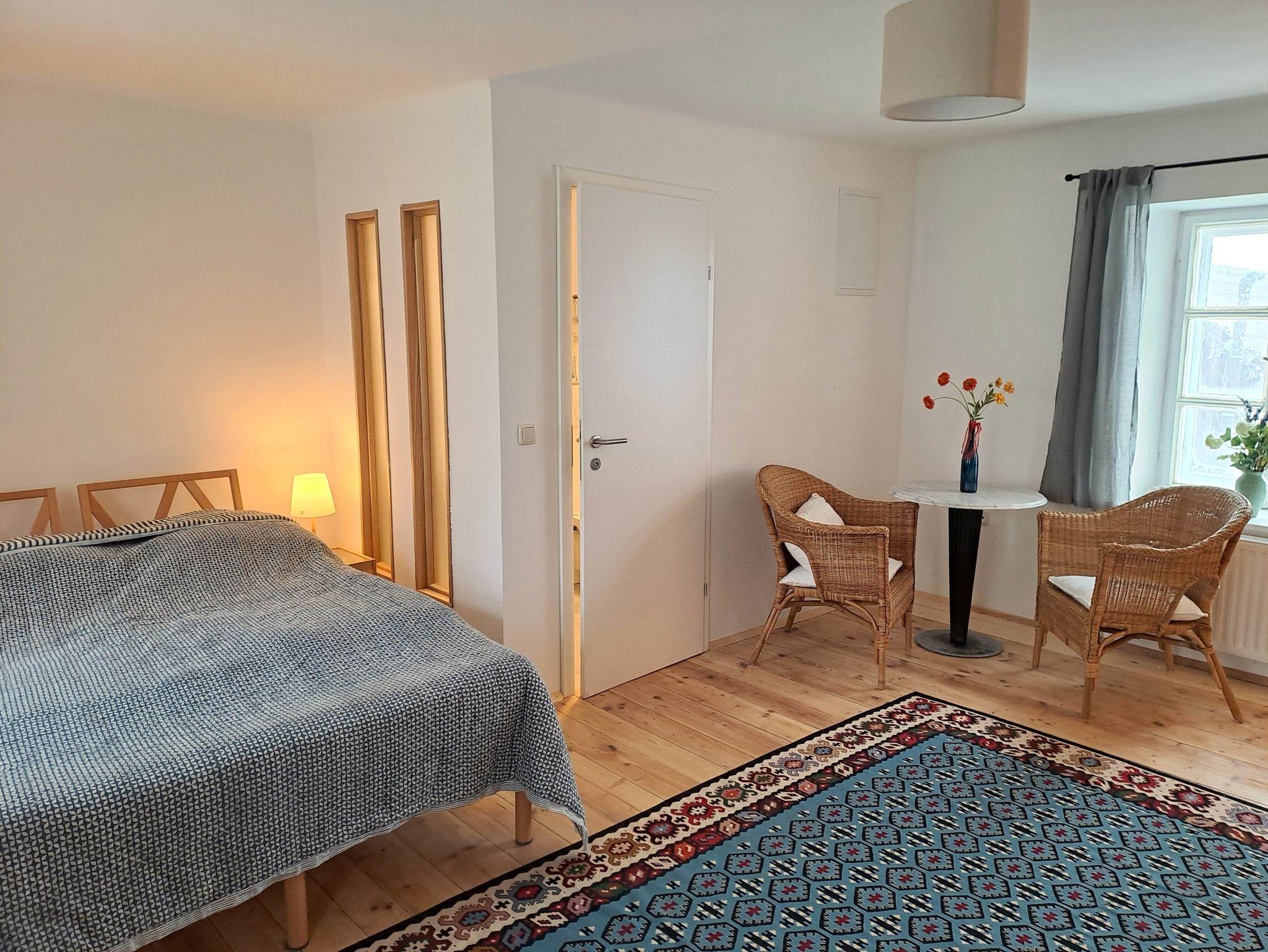 Das Zimmer Milchkandl bietet Ihnen ein behagliches und stilvolles Ambiente für eine erholsame Auszeit. Ausgestattet mit einem großzügigen Queensize-Bett und hochwertigen Vollholzmöbeln, vereint es natürlichen Charme mit modernem Komfort. Eine gemütliche Leseecke lädt zum Entspannen ein, während der Blick in den Garten für eine wohltuende Atmosphäre sorgt.