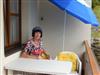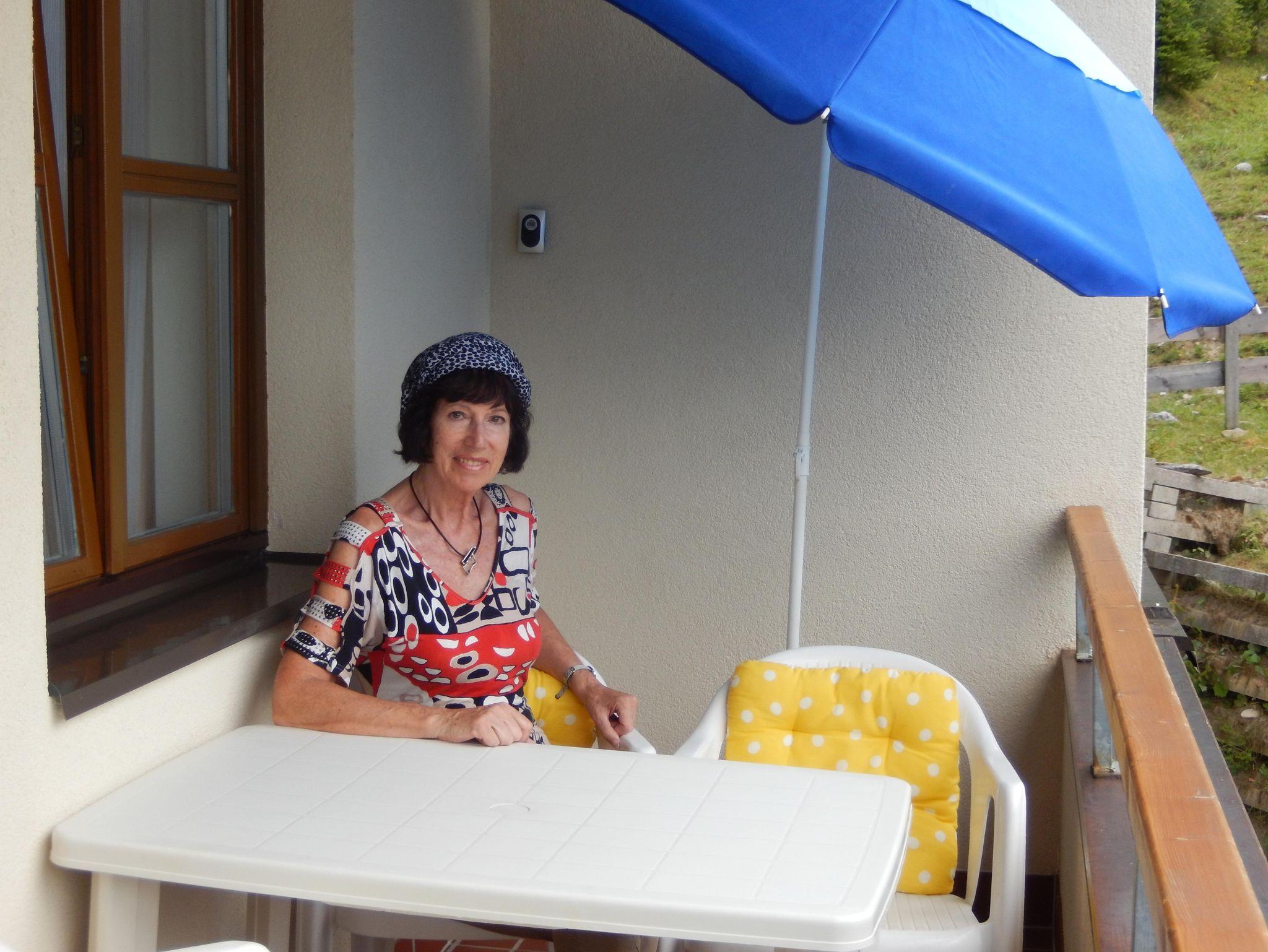 1 großen West-Balkon mit Sitzgarnitur, Tisch und Sonnenschirm sowie schönem Ausblick ins Dorfgeschehen und auf die Berge,
