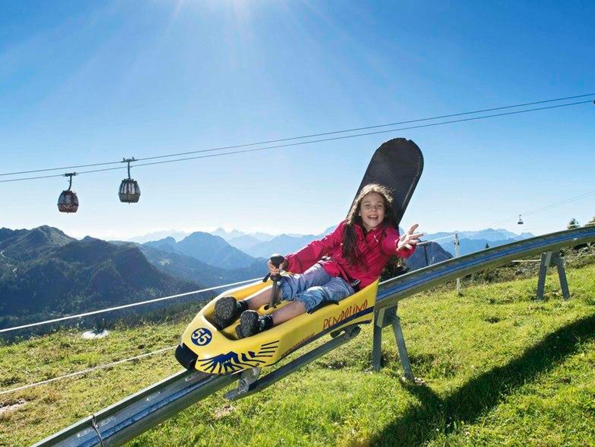 Eine beleuchtete Rodelbahn führt bis zum Haus.
