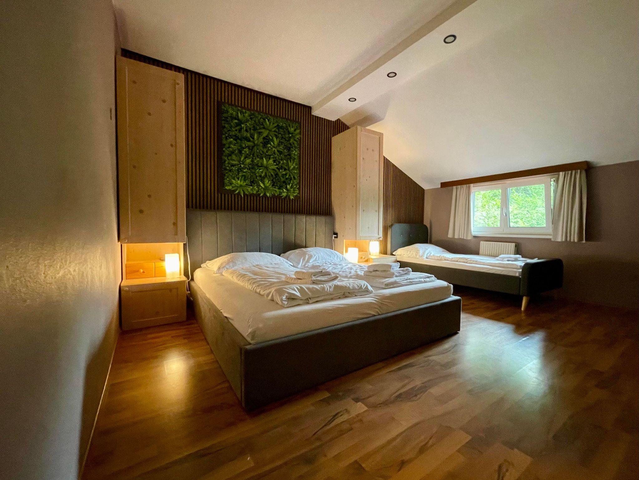 Dich erwartet ein Apartment mit 2 Schlafzimmern, Küche und Badezimmer. Beide Schlafzimmer haben jeweils ein Doppelbett und ein Einzelbett.