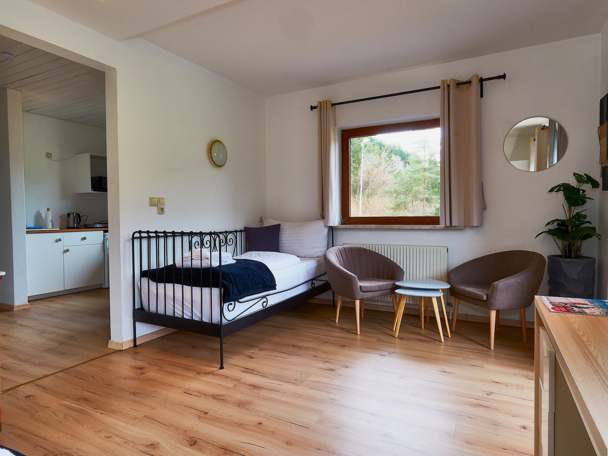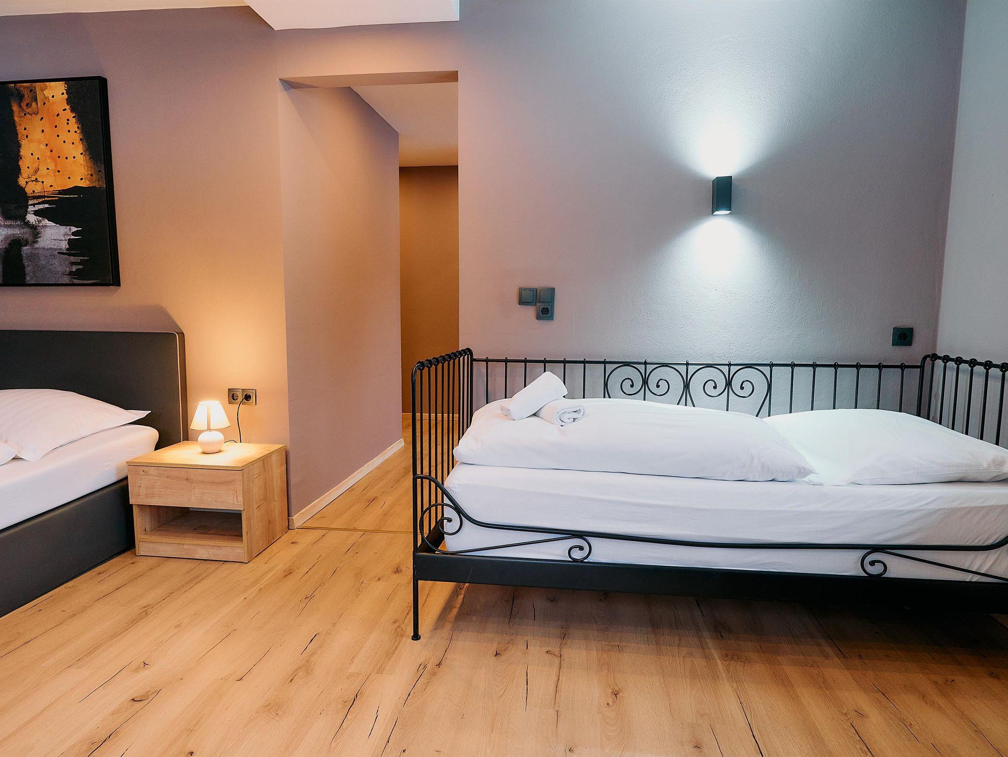 Dich erwartet ein Studio, mit einem Doppelbett und Einzelbett. Außerdem hat das Studio eine eigene Küche, ein Badezimmer sowie eine Balkon.