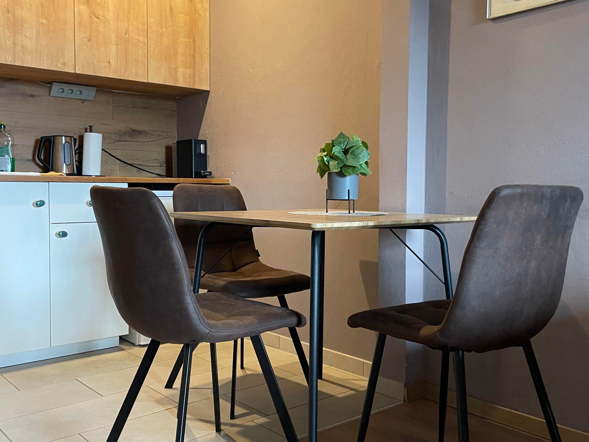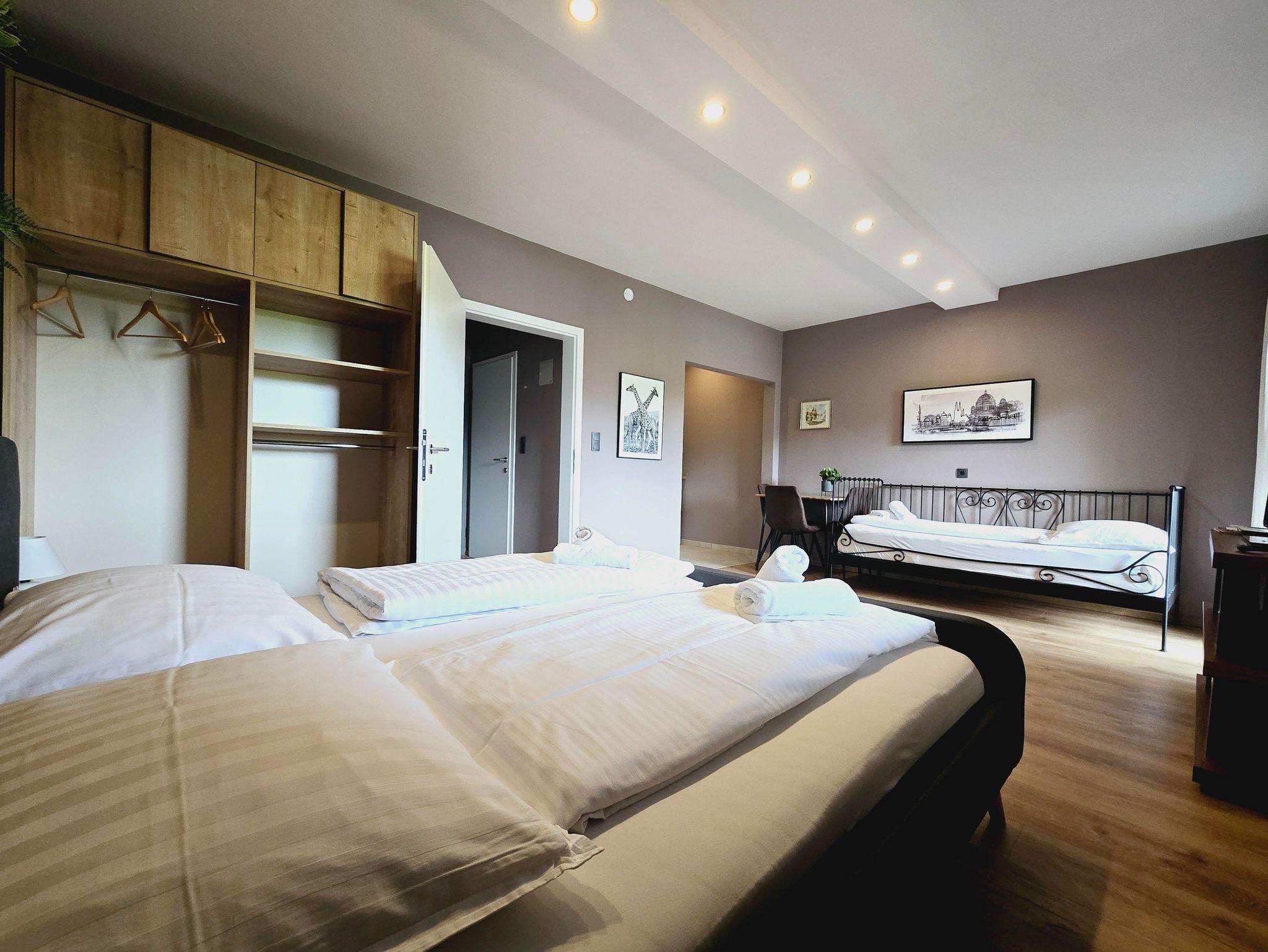 Dich erwartet ein Studio mit einem Einzelbetten und einem Doppelbett. Es gibt eine Küche, ein Badezimmer und einen Balkon.