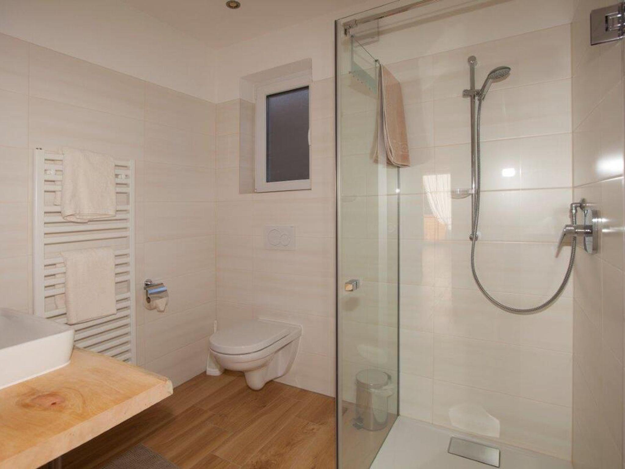 Das Apartment verfügt weiters über einen Südbalkon mit einer herrlichen Aussicht auf die Nauderer Bergwelt sowie 2 Bäder mit Dusche und 3 WC’s.