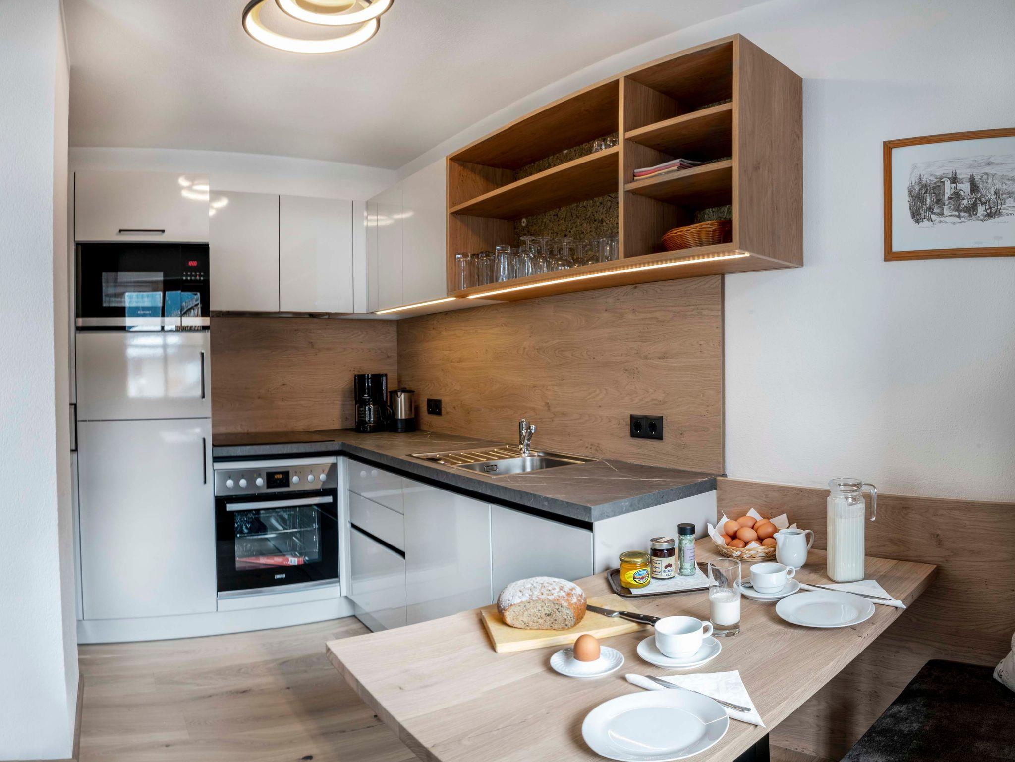 6 Apartments strahlen seit Dezember 2021 im neuen Glanz mit wohnlichen Böden und Möblen aus heimischen Hölzern. 2 weitere Wohnungen laden im gemütlichen Landhausstil unter dem Fichtenholzdachstuhl zum Urlauben ein.