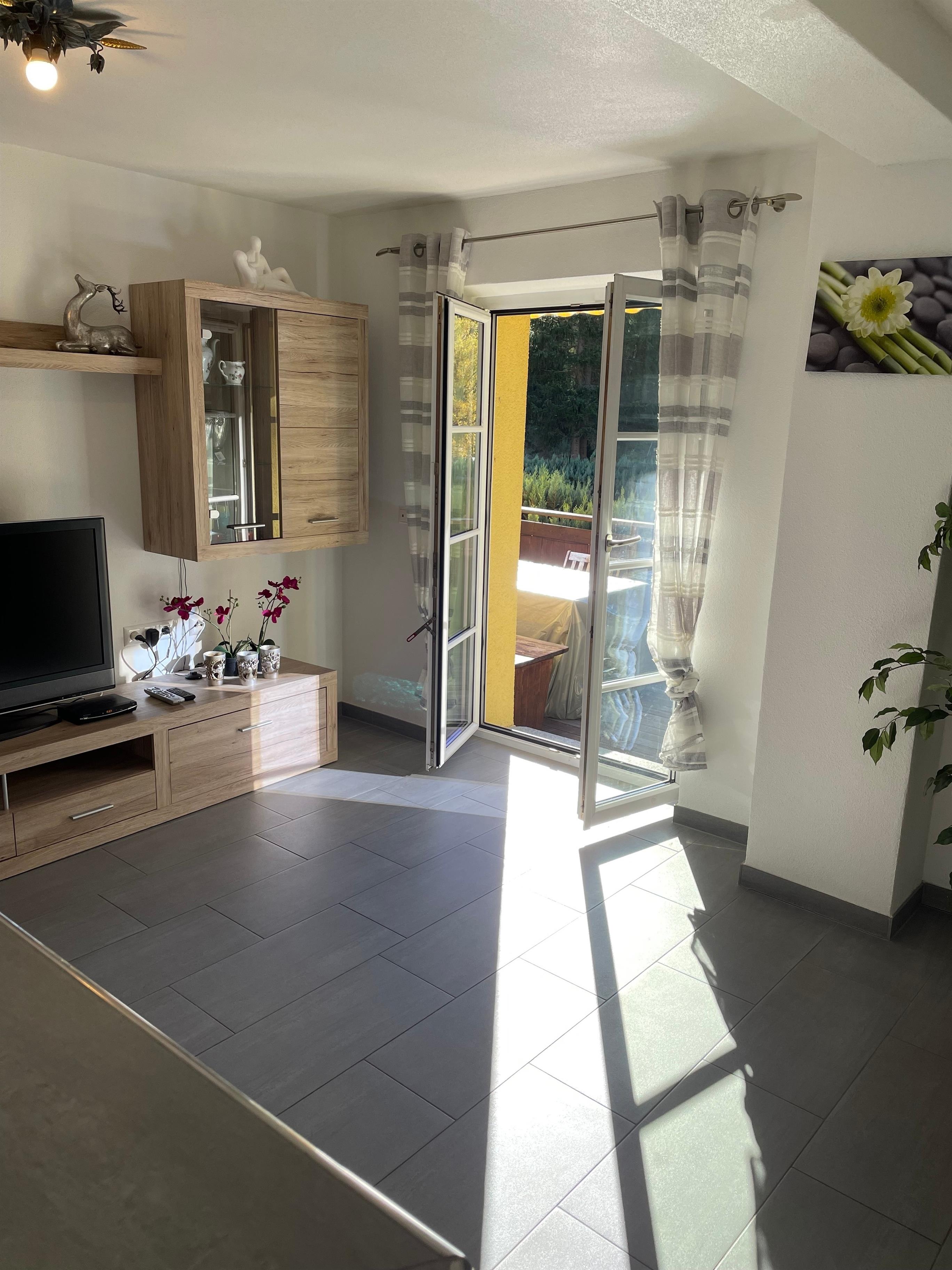 Im separaten Wohnzimmer mit 27qm sorgen ein TV-Flachbildschirm sowie eine Stereoanlage für die musikalische Unterhaltung. Hier finden Sie auch die Schlafcouch für 2 Personen, sowie die Highlights der Wohnung einen wunderschönen Kachelofen und den direkten Zugang auf die 30qm große Terrasse.