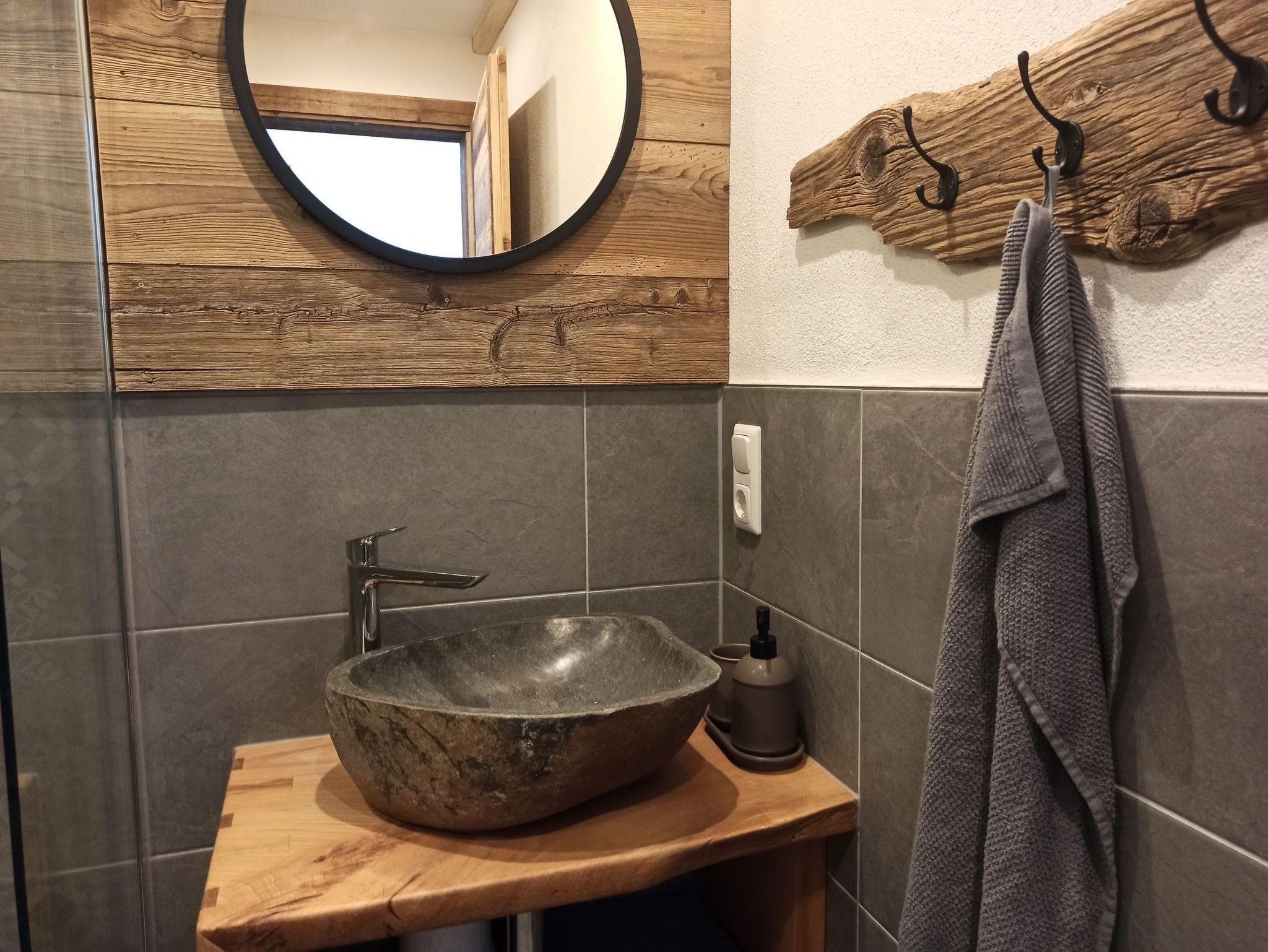 Das Badezimmer ist mit einem ebenerdigen Duschbereich ausgestattet und verfügt über Fußbodenheizung. Handtücher und Föhn stehen den Gästen frei zur Verfügung.