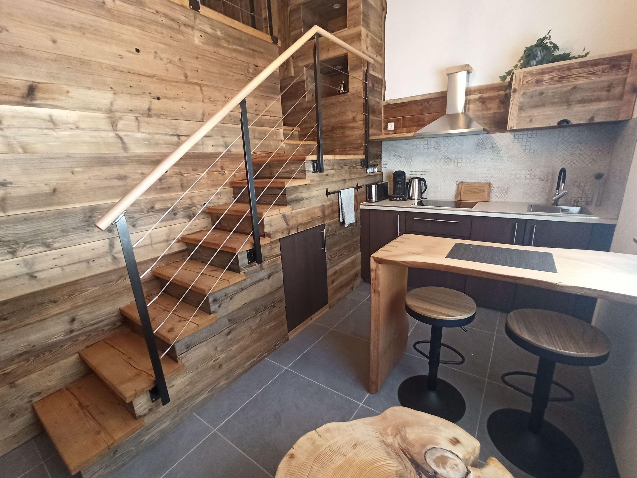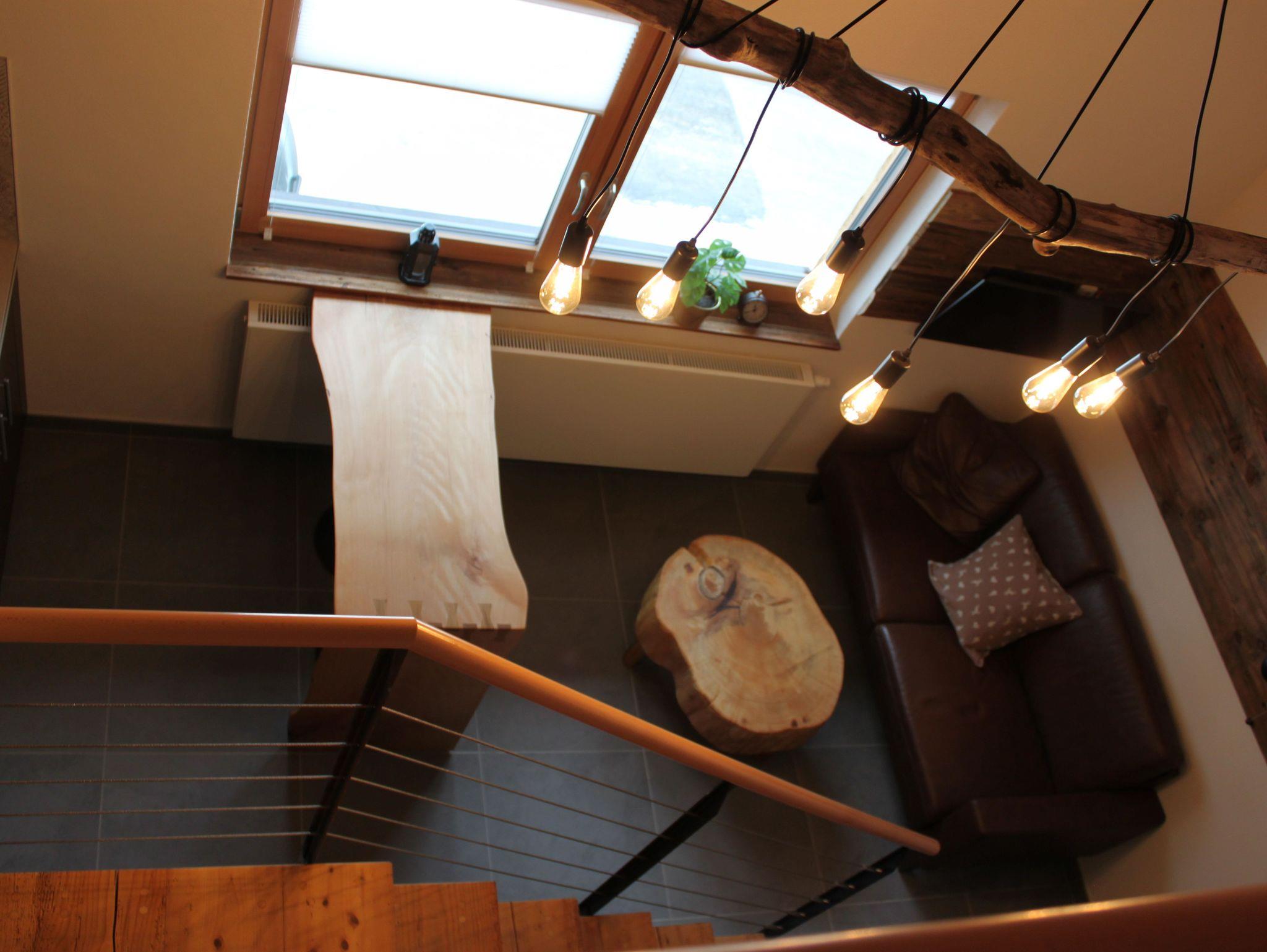 Das 25 qm große Appartement besticht durch den besonderen Charme eines rustikalen Tiny Houses. Auf kleinem Raum mit zwei Ebenen befinden sich der Wohn-/Essbereich mit Küche, sowie ein Schlafbereich mit Doppelbett.