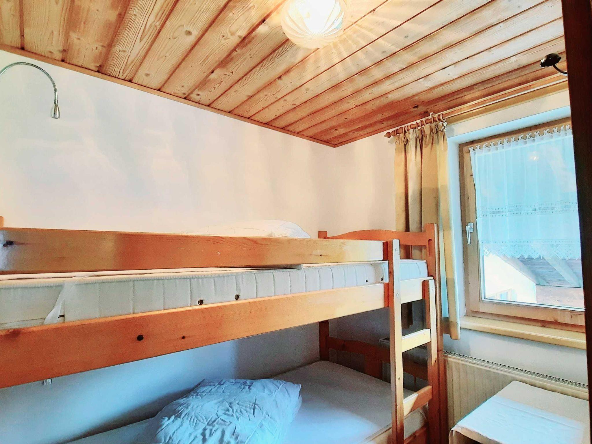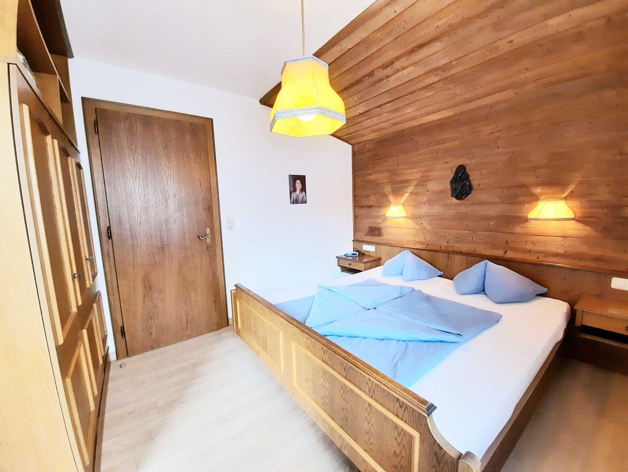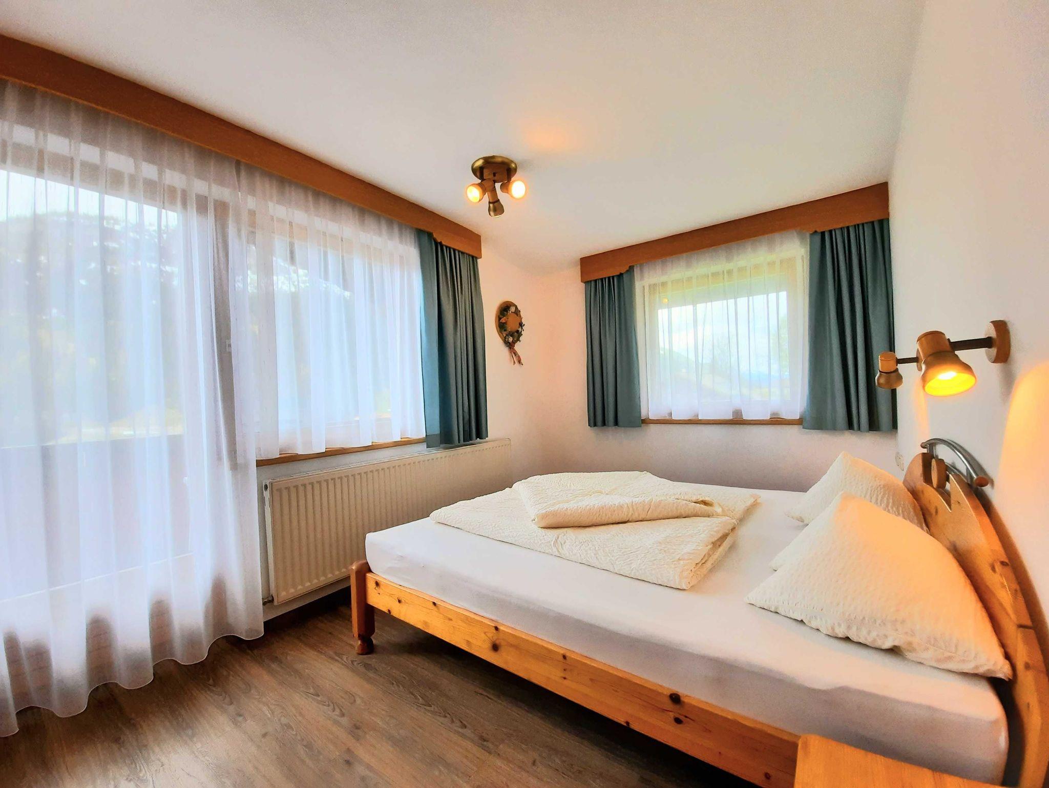 Ferienwohnung im ländlichen, tiroler Stil: bestehend aus einem Doppelbettzimmer, einem Schlafraum mit Stockbetten, Essecke mit integriertem Küchenblock, Kabel-TV 120 Programmen, Dusche/WC, Gangbereich mit Garderobe, Südbalkon, Zimmersafe , Telefon,W-LAN, Parkfläche am Haus ..