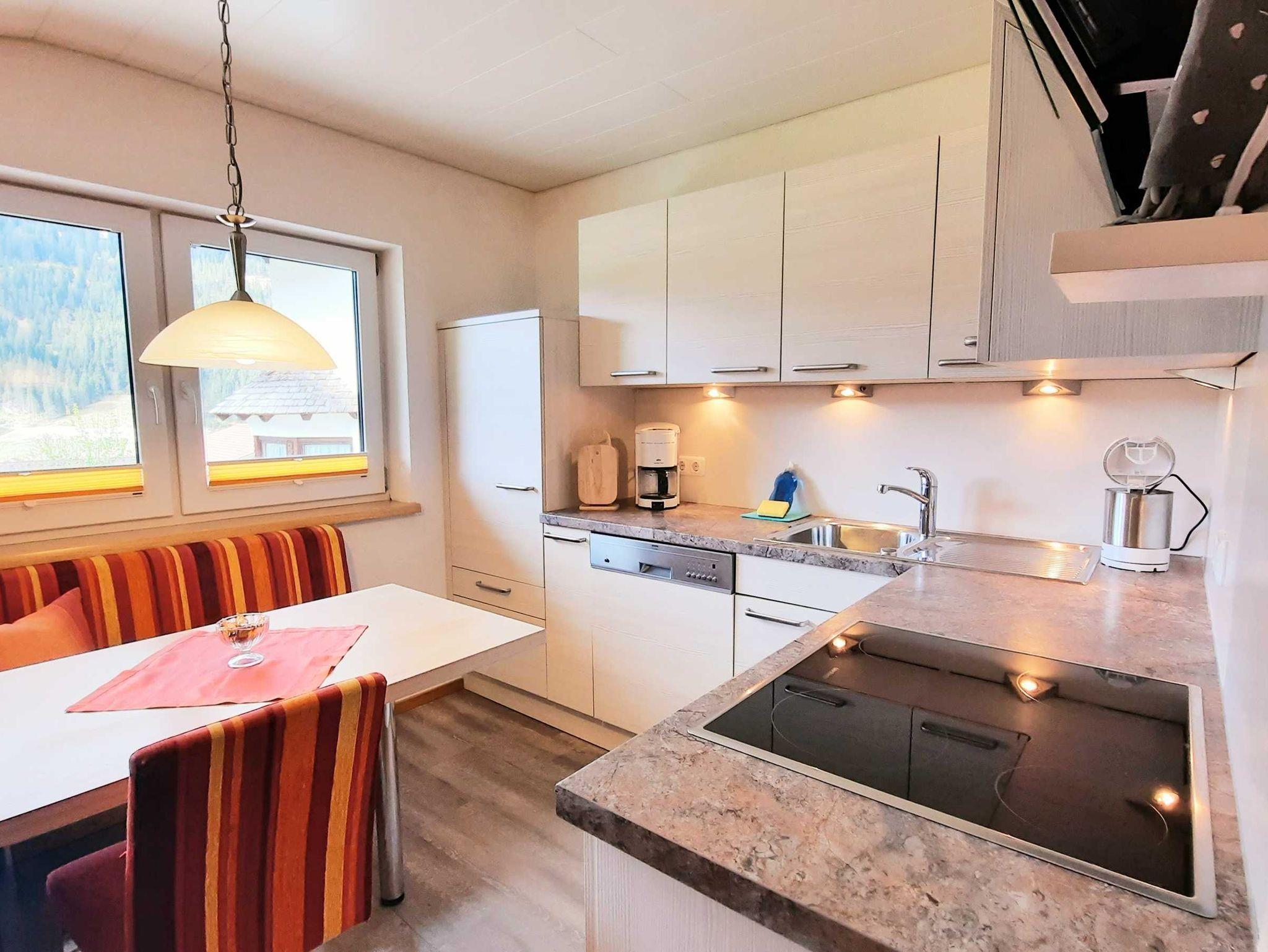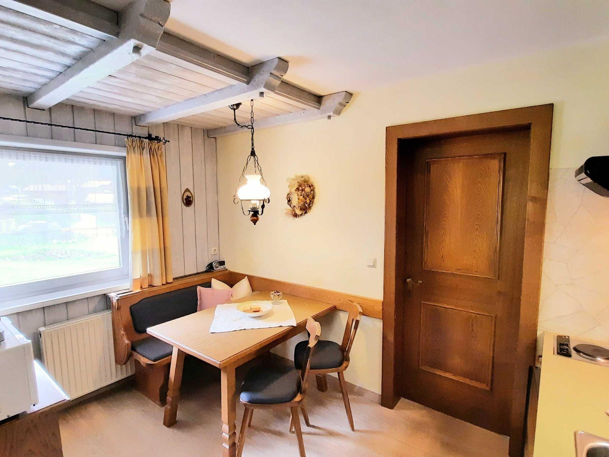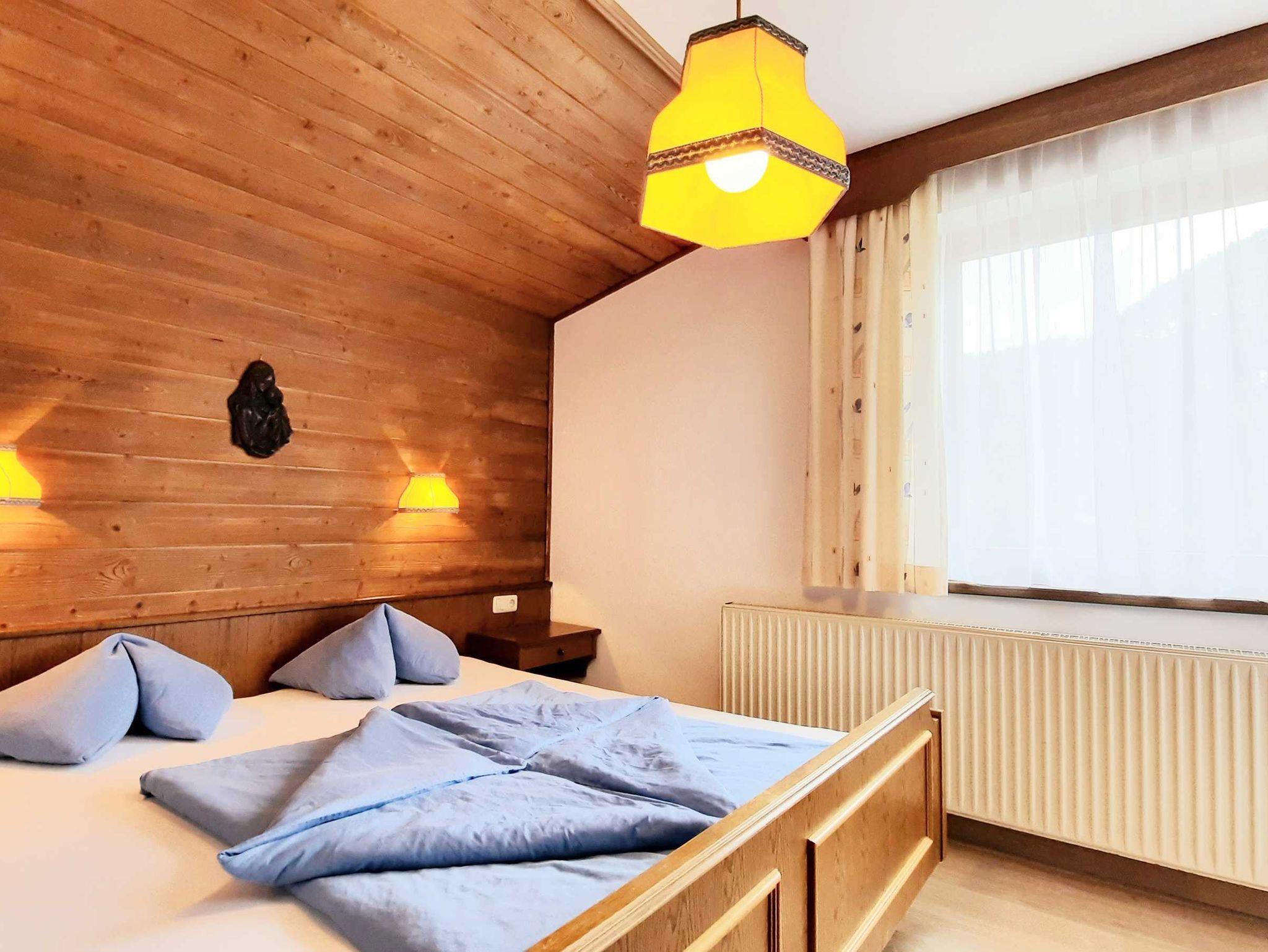 Ferienwohnung im ländlichen, tiroler Stil: bestehend aus einem Doppelbettzimmer, einem Schlafraum mit Stockbetten, Essecke mit integriertem Küchenblock, Kabel-TV 120 Programmen, Dusche/WC, Gangbereich mit Garderobe, Südbalkon, Zimmersafe , Telefon,W-LAN, Parkfläche am Haus ..