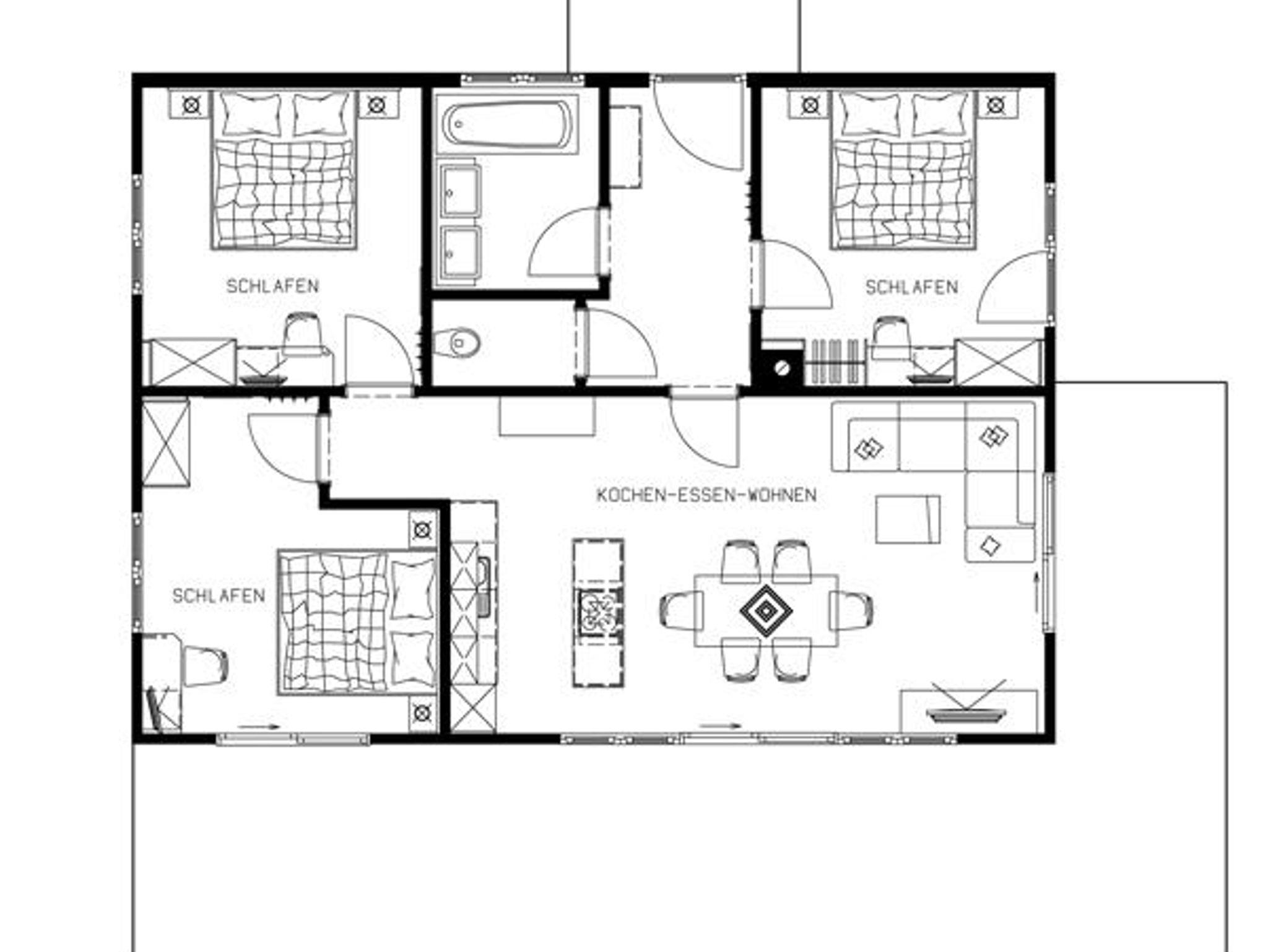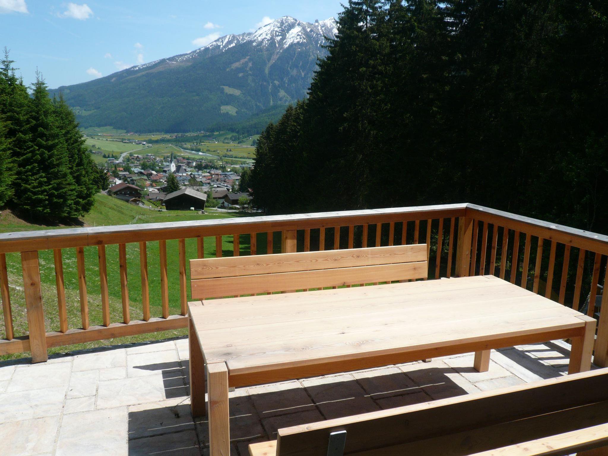 Appartement 1: 4-Zimmer-Wohnung 86 m2 im 1. Stock, komfortabel, gemütlich und mit viel Holz eingerichtet: Eingang, 3 Doppelzimmer, Wohnküche, Bad und WC sep., 40 m2 Terrasse, Internet, Sat-TV (Flachbildschirm).