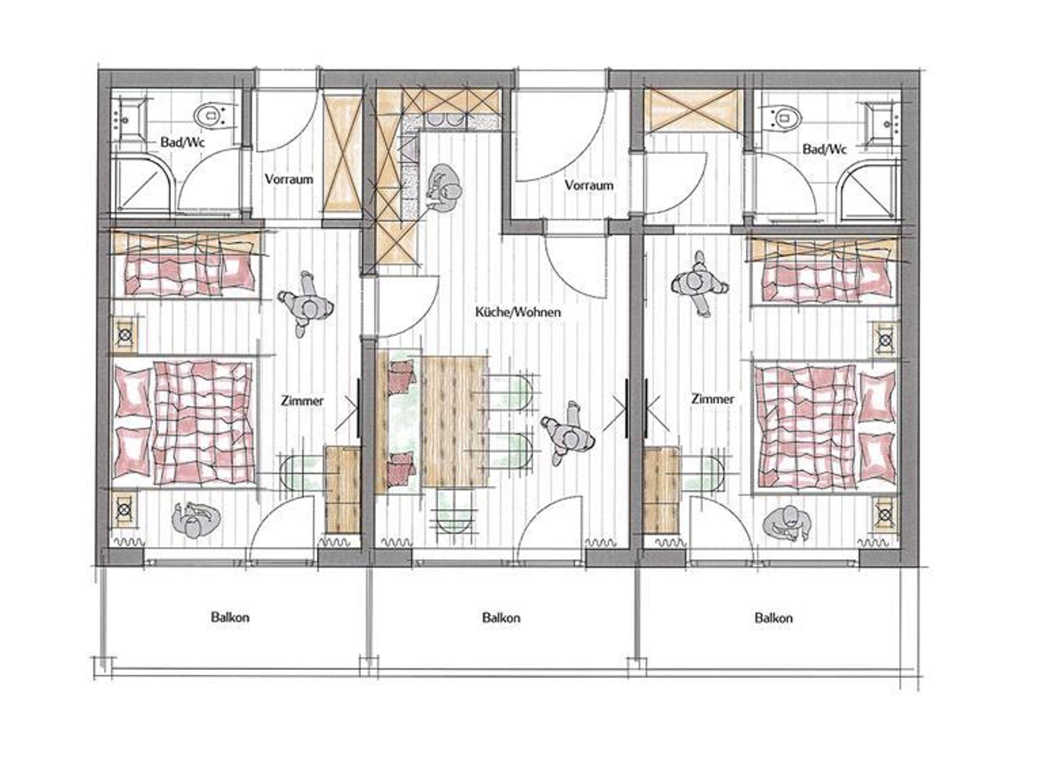 Das Appartement besteht aus 2 Schlafzimmern für je 2-4 Personen, 2 Badezimmern und einer großen Wohnküche. Die Wohnküche ist mit einem Flat-Screen-TV, großen Esstisch und Balkon ausgestattet. Die Küche verfügt über Kühlschrank, Geschirrspülmaschine, Microwelle, Kaffeemaschine, Wasserkocher, Backofen, sowie dem kompletten Geschirr. 2 Schlafzimmer mit Flat-Screen-TV, Schreibtisch, großen Ankleidespiegel und Balkon. 2 Badezimmer mit Dusche, WC, Haarföhn und Handtuchtrockner. Freies W-lan in der ganzen Wohnung.