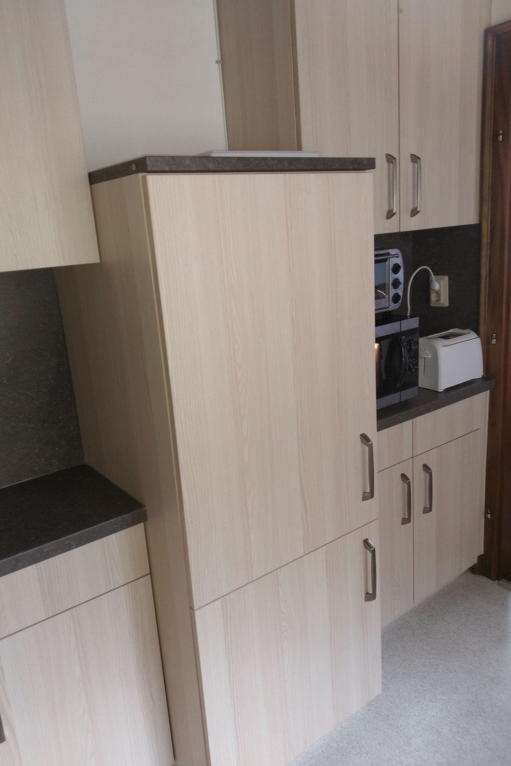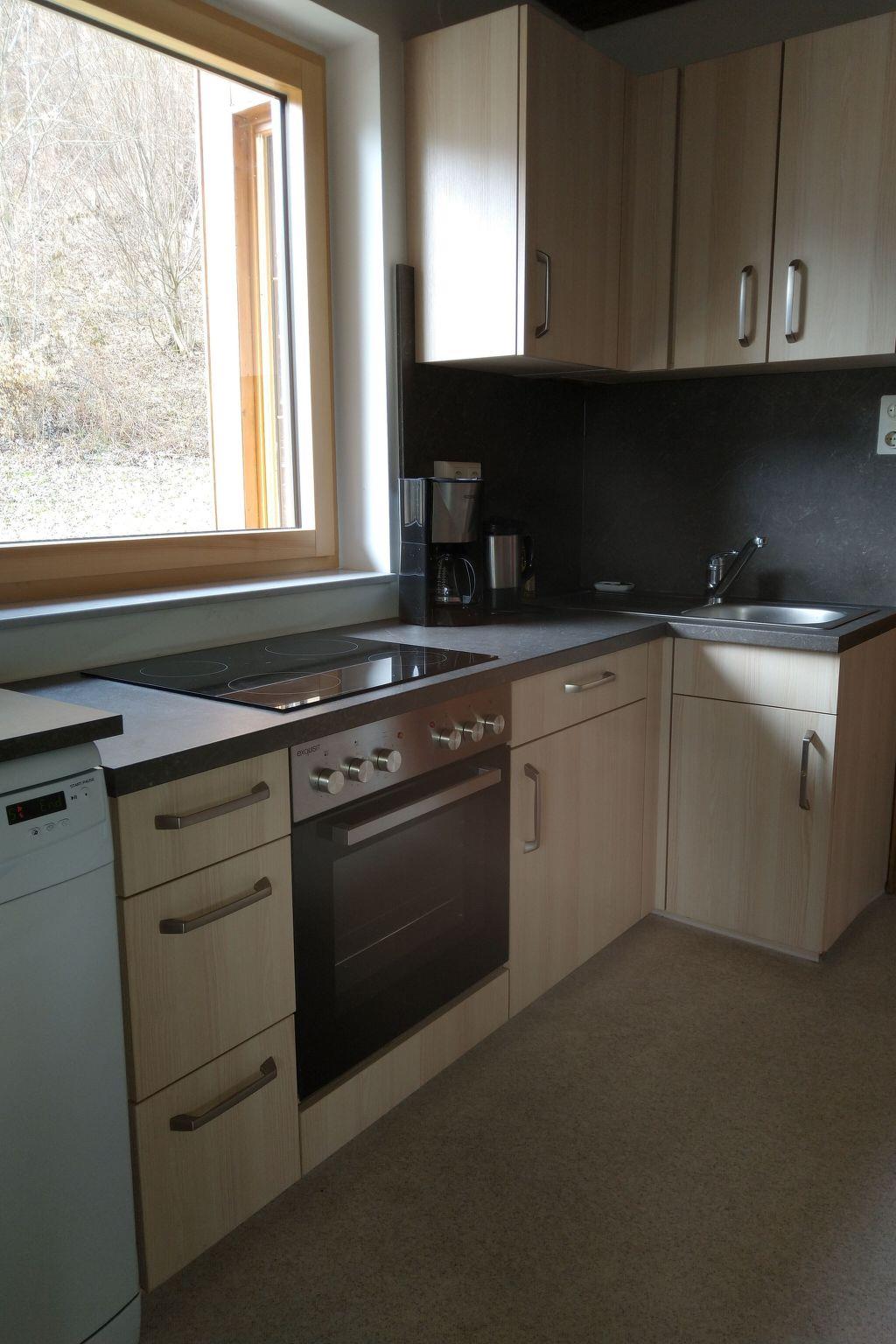 * Small, modern kitchen: electric cooker with oven, microwave, coffee machine, fridge, small dishwasher.