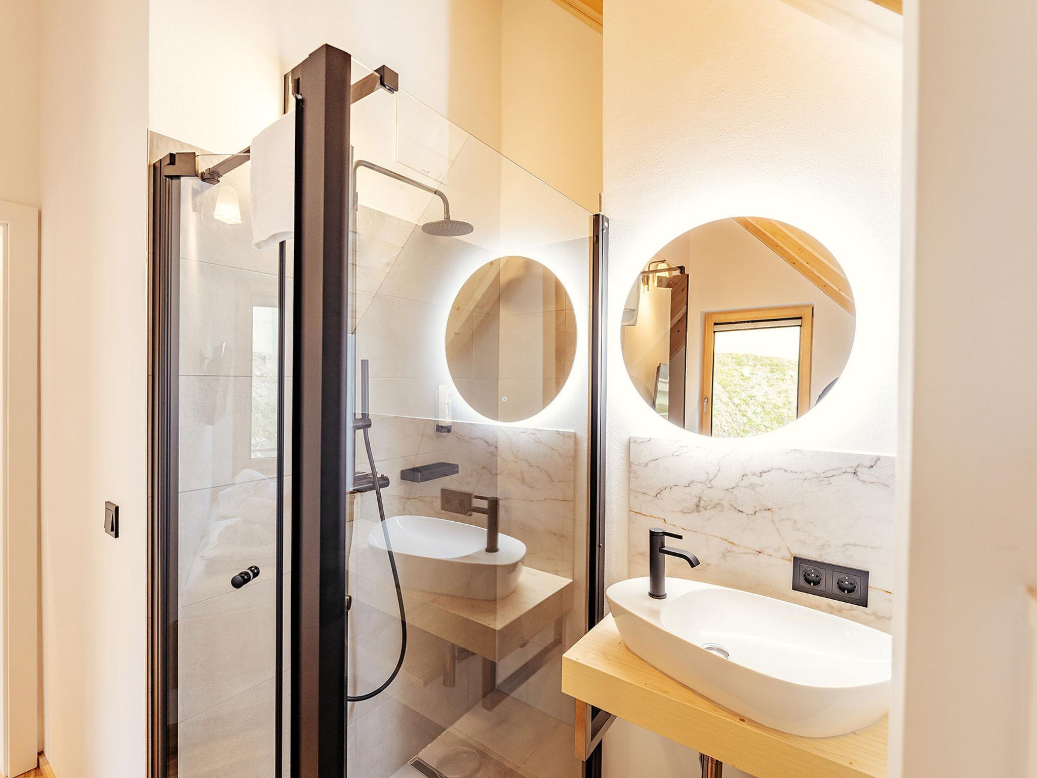 "Chalet Nr. 4 mit 2 Schlafzimmern und Sauna", 3-room house 67 m2 on 2 levels. Object suitable for 6 adults. 1 room with 1 double bed and TV. 1 room with 1 double bed. Living room with 1 sofabed and 1 pull-out bed. Kitchen, open kitchen (dishwasher, toaster, kettle, microwave, freezer, electric coffee machine). Bath/WC, shower/WC, sep. WC. Terrace. Facilities: sauna. Please note: non-smokers only. Maximum 2 pets/ dogs allowed.