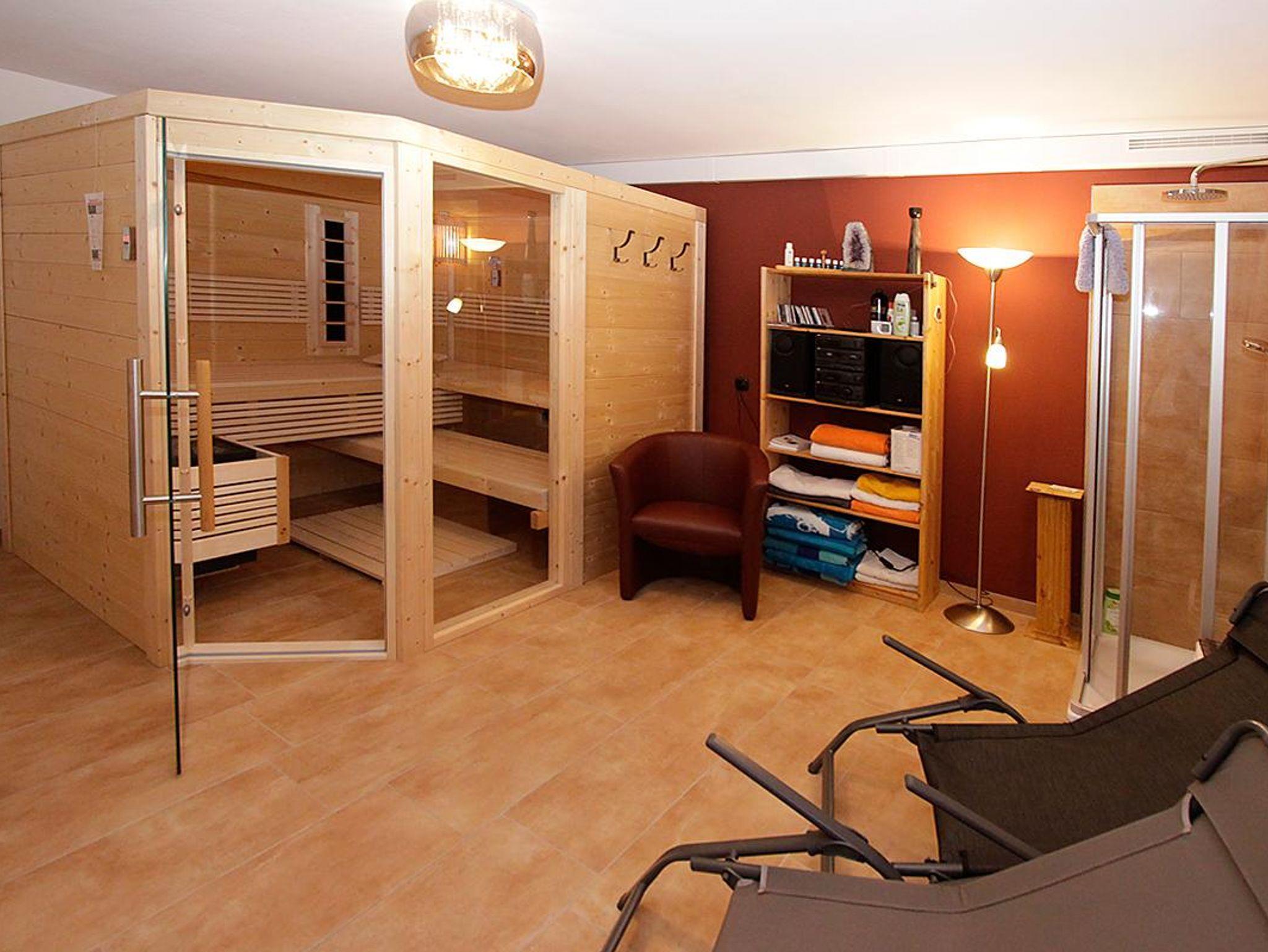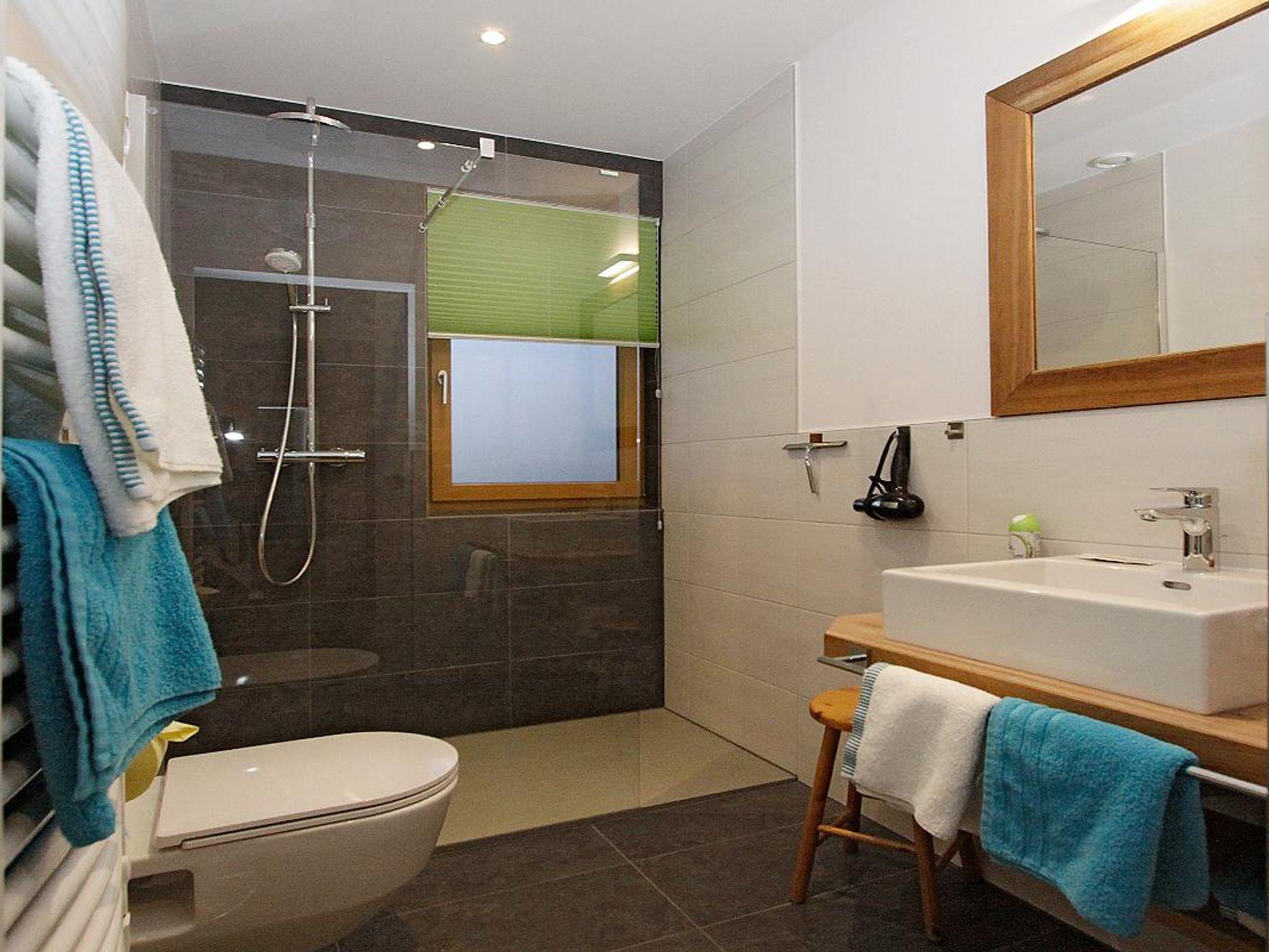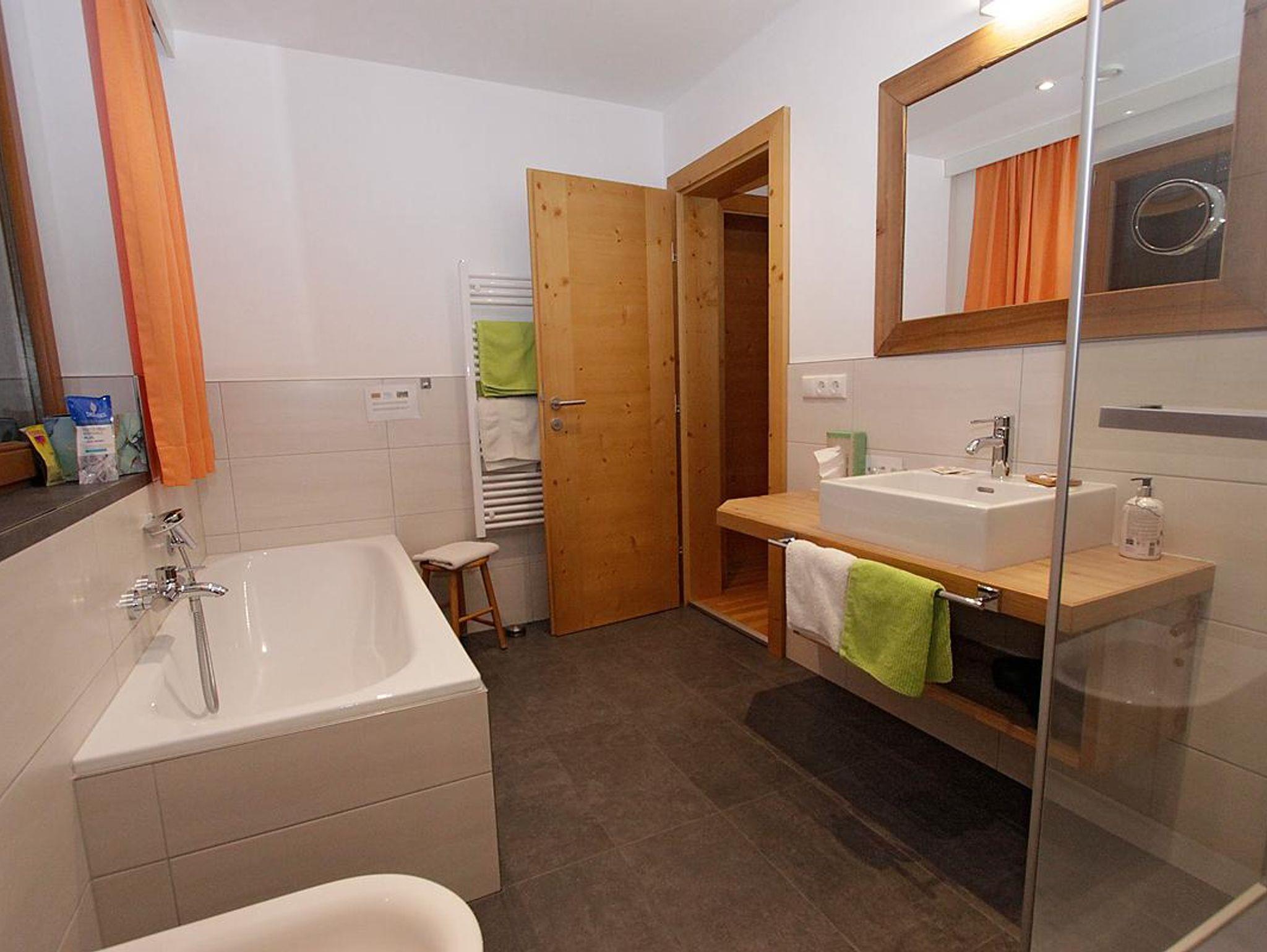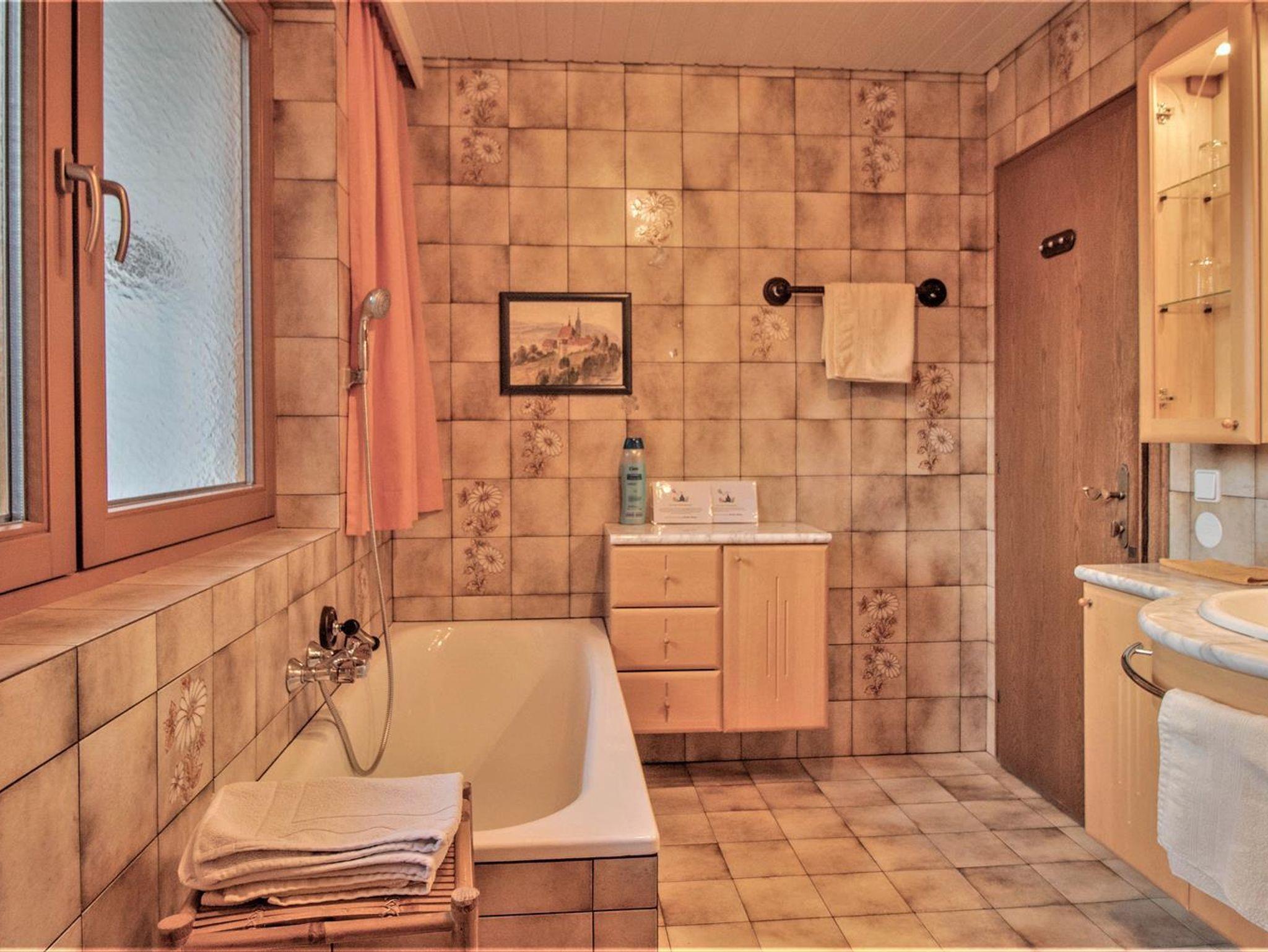 Großes Bad mit D/WC und Badewanne. Im Schlafzimmer ein Doppelbett und ein Schlafsofa.