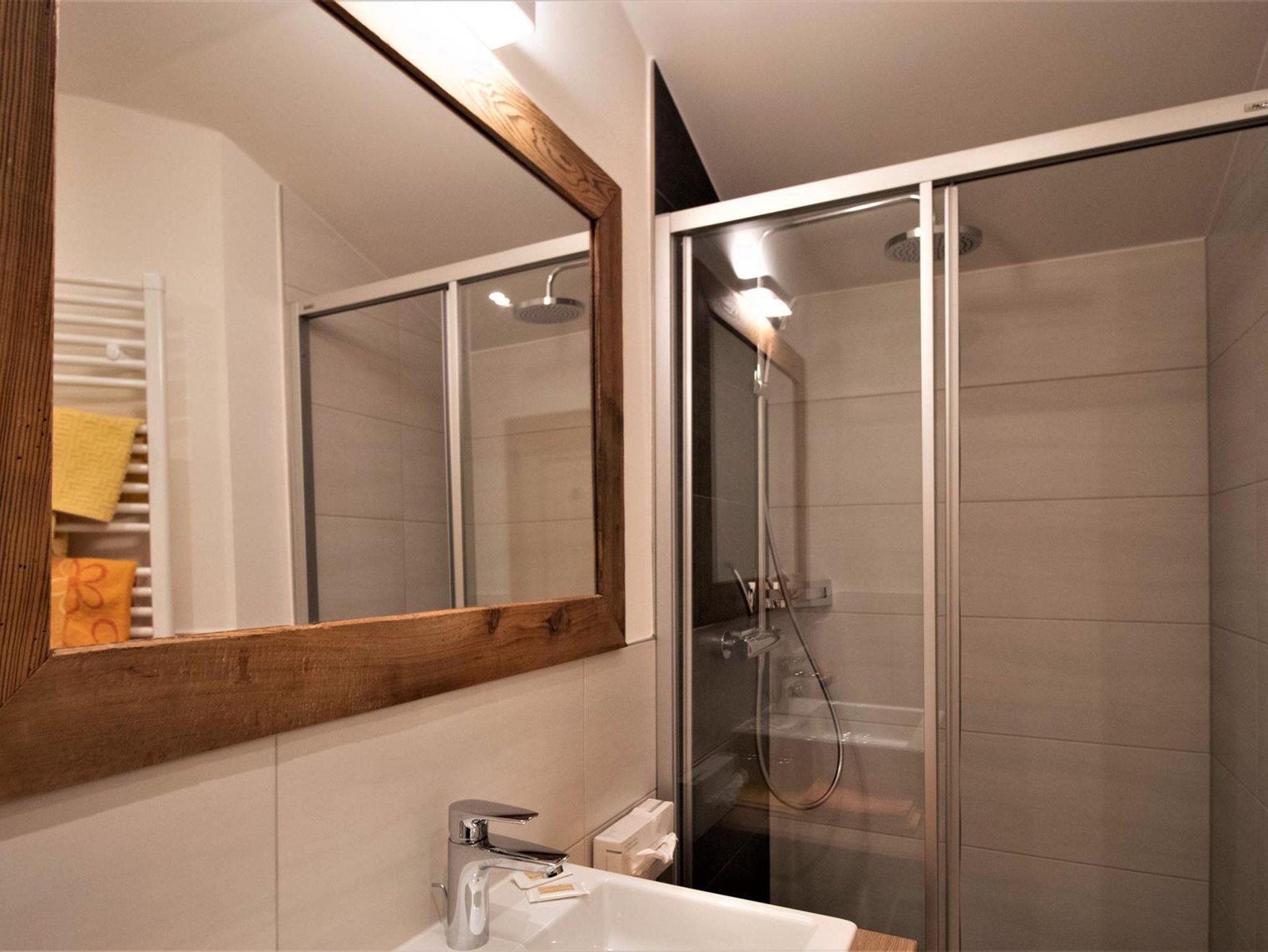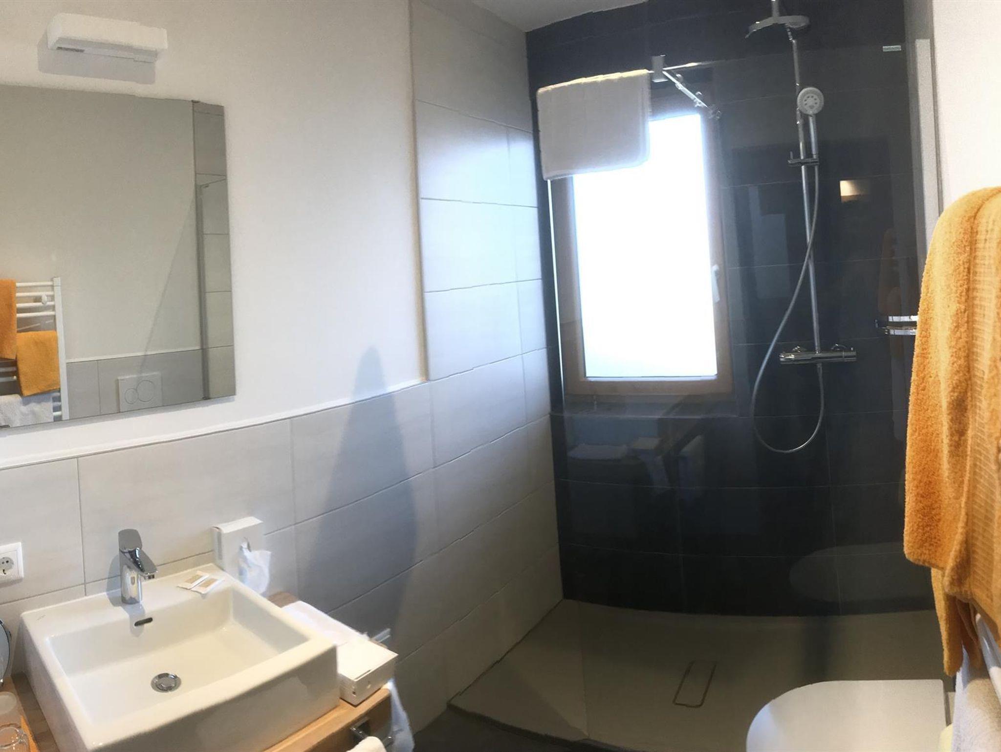 Helle moderne Bäder, D/WC, SAT-TV, integriertes Radio. Frühstücksbuffet und Parklplatz beim Haus.