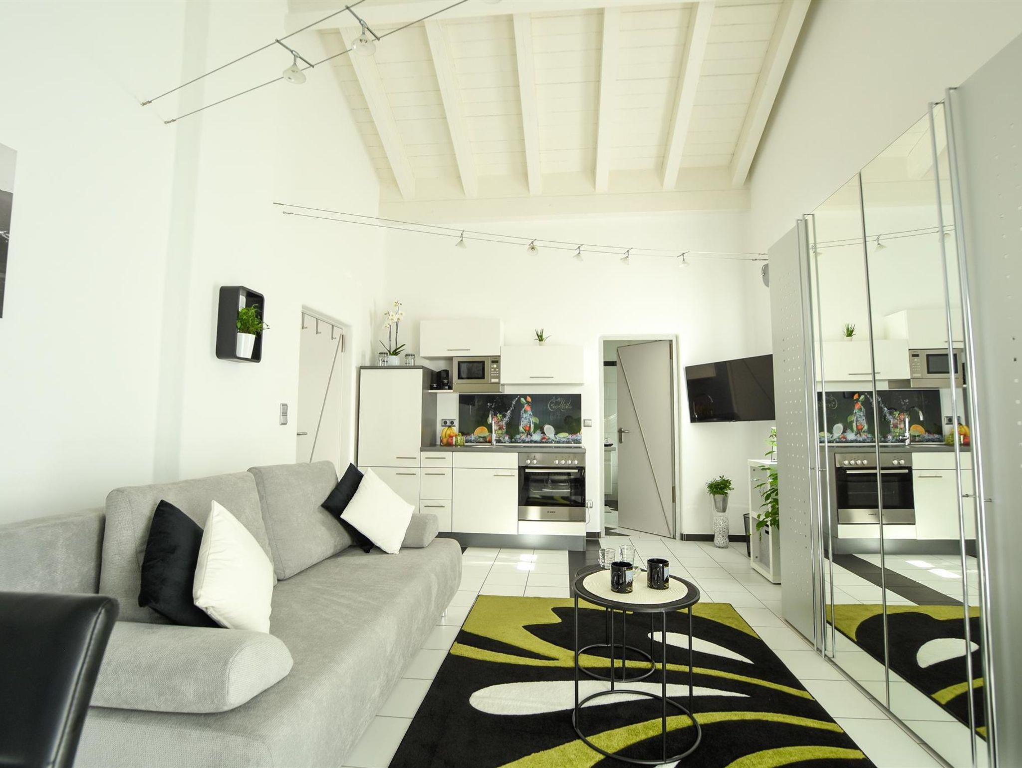 Ausstattung der Wohnungen: Bettwäsche, Handtücher, Geschirrtücher, Elektroherd mit Backofen, Mikrowelle, Kühlschrank inkl. Gefrierfach, Geschirrspüler, Kaffeemaschine, Toaster, Mixer, Bügeleisen, Bügelbrett und Waschmaschine.