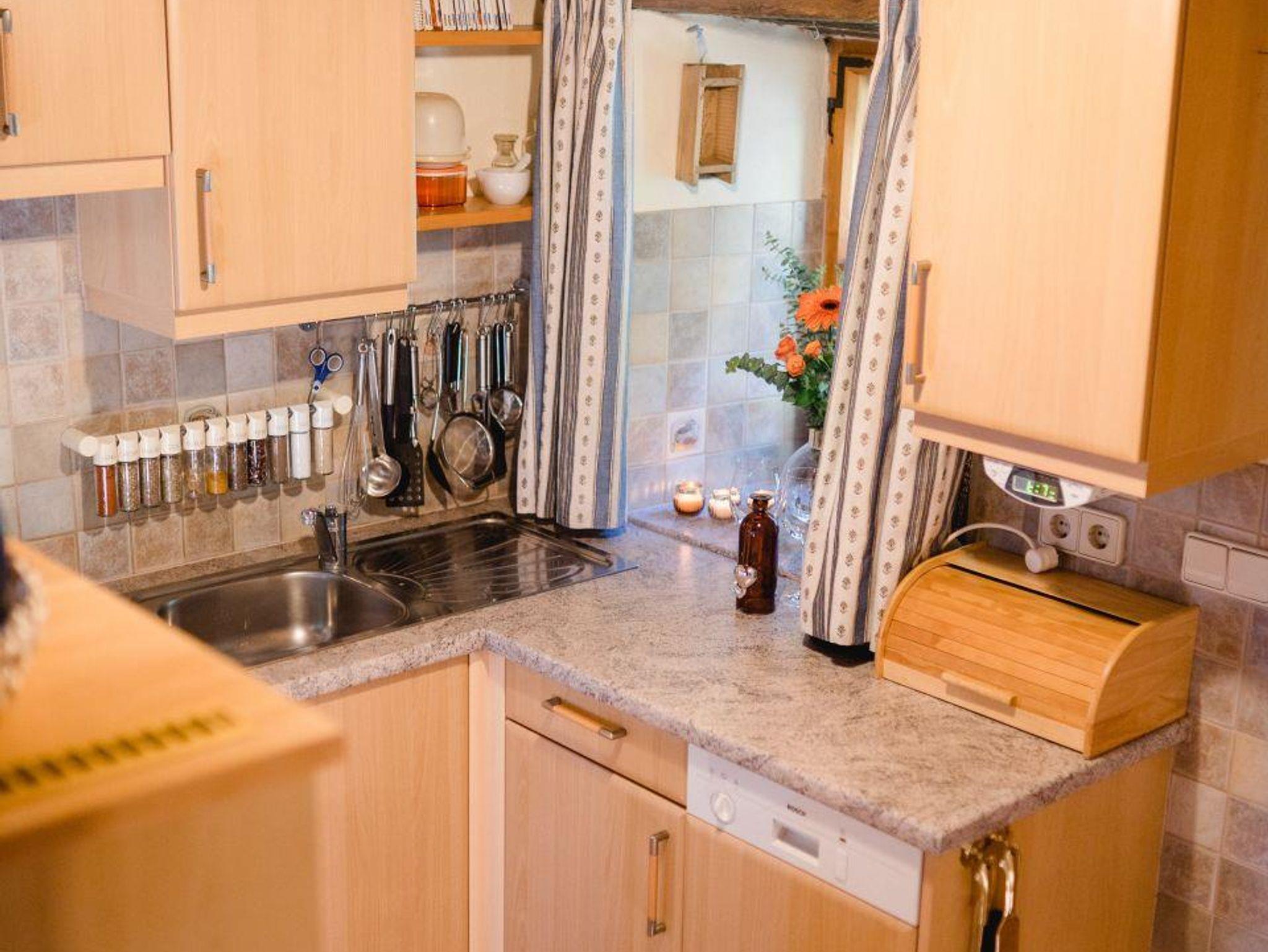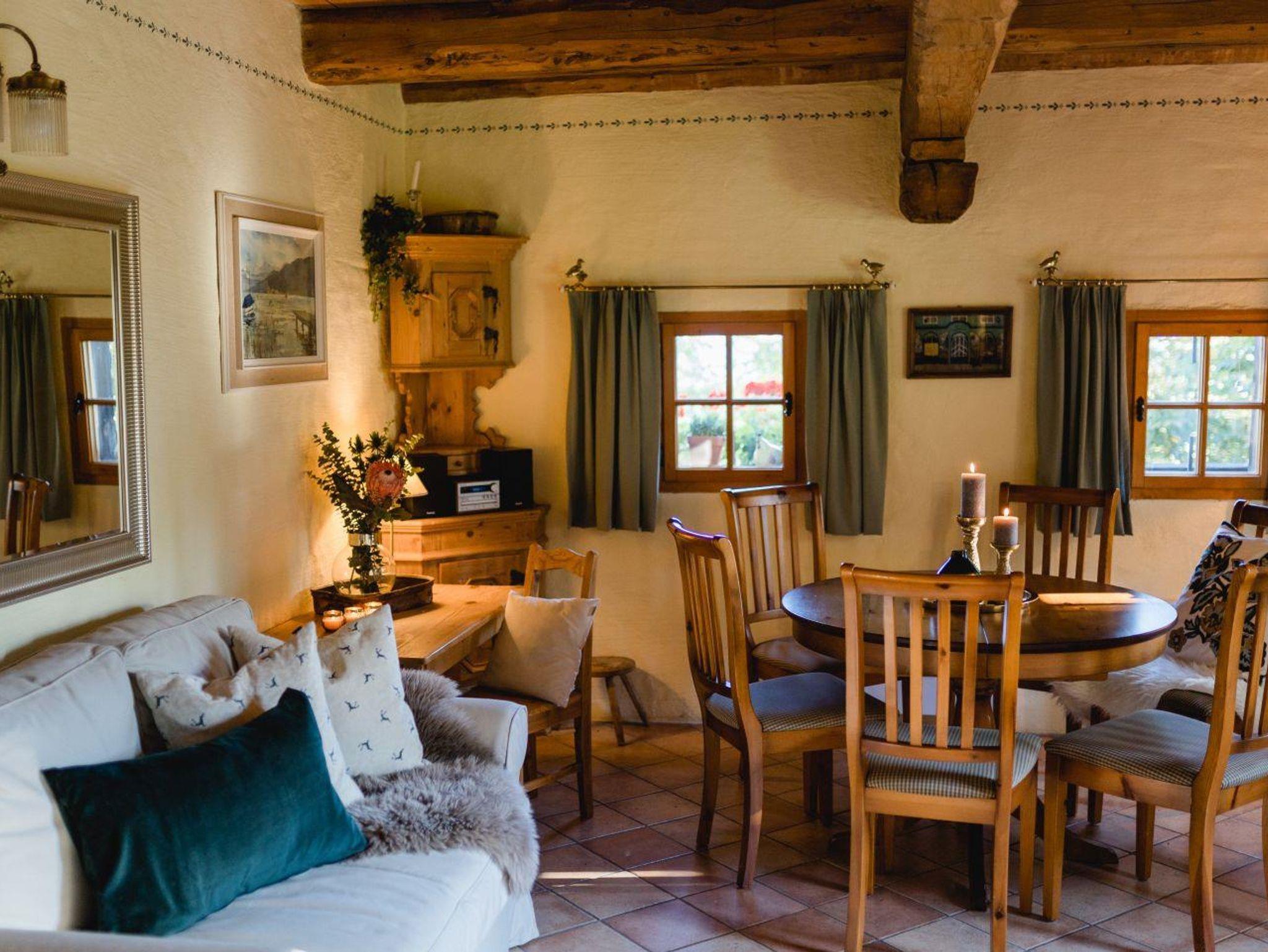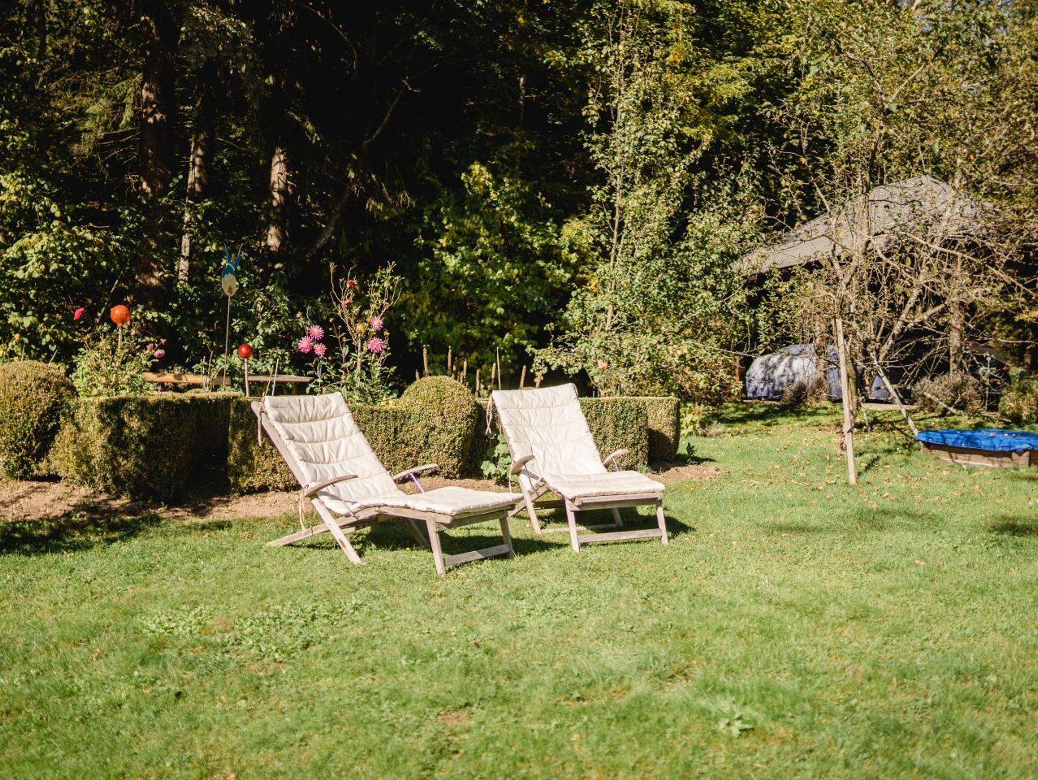 Ein umzäunter Garten steht zum Entspannen zur Verfügung. Im Erdgeschoss befindet sich die Küche, ein Essbereich sowie ein kleines Bad mit Waschmaschine und WC. Über die Treppe geht es in den ersten Stock wo es ein Wohnzimmer, das Schlafzimmer (beide Räume offen) sowie ein Bad gibt. Vom Wohnraum geht es auf den Balkon von dem aus man einen herrlichen Blick in die idyllische Umgebung hat.