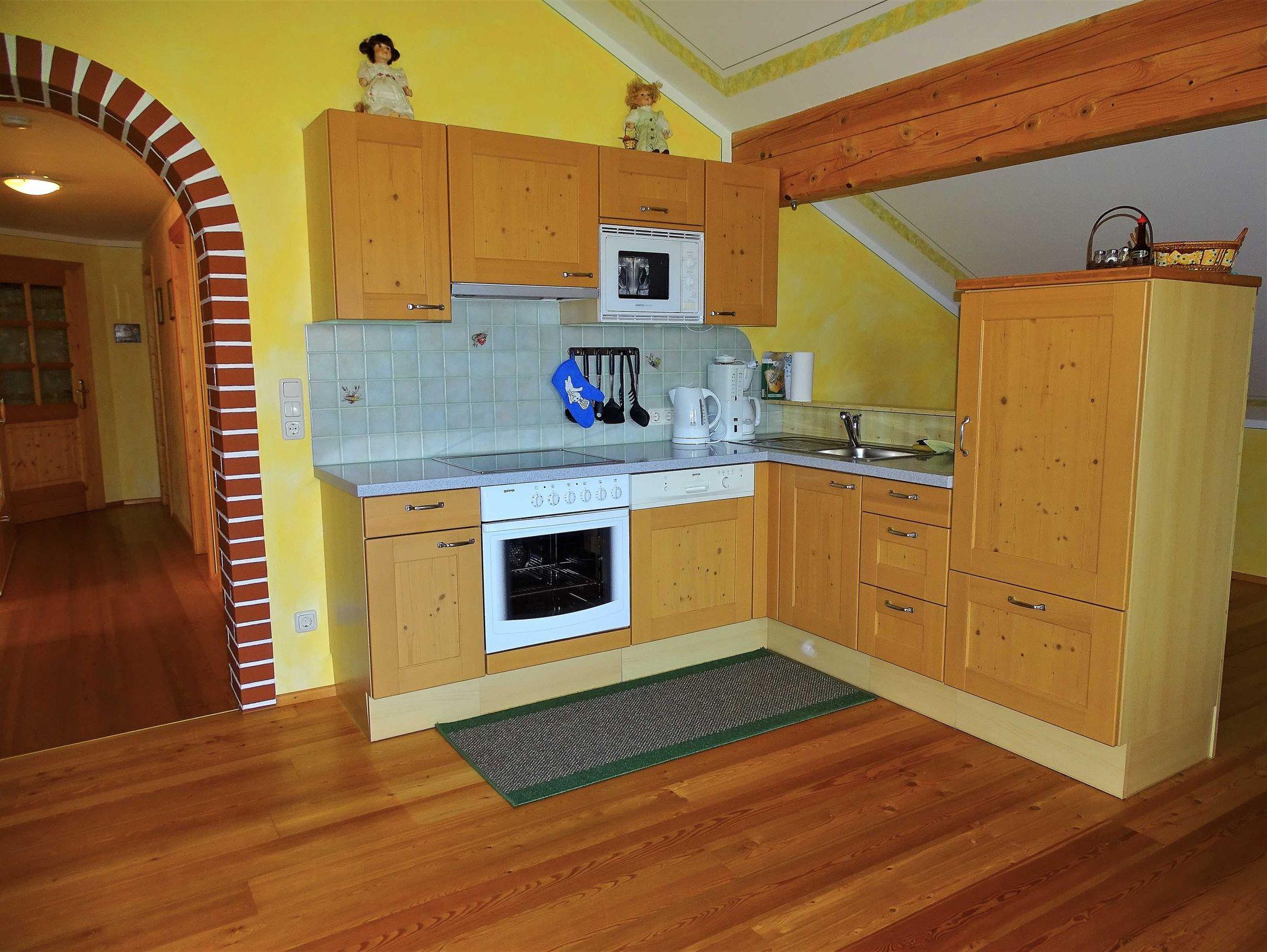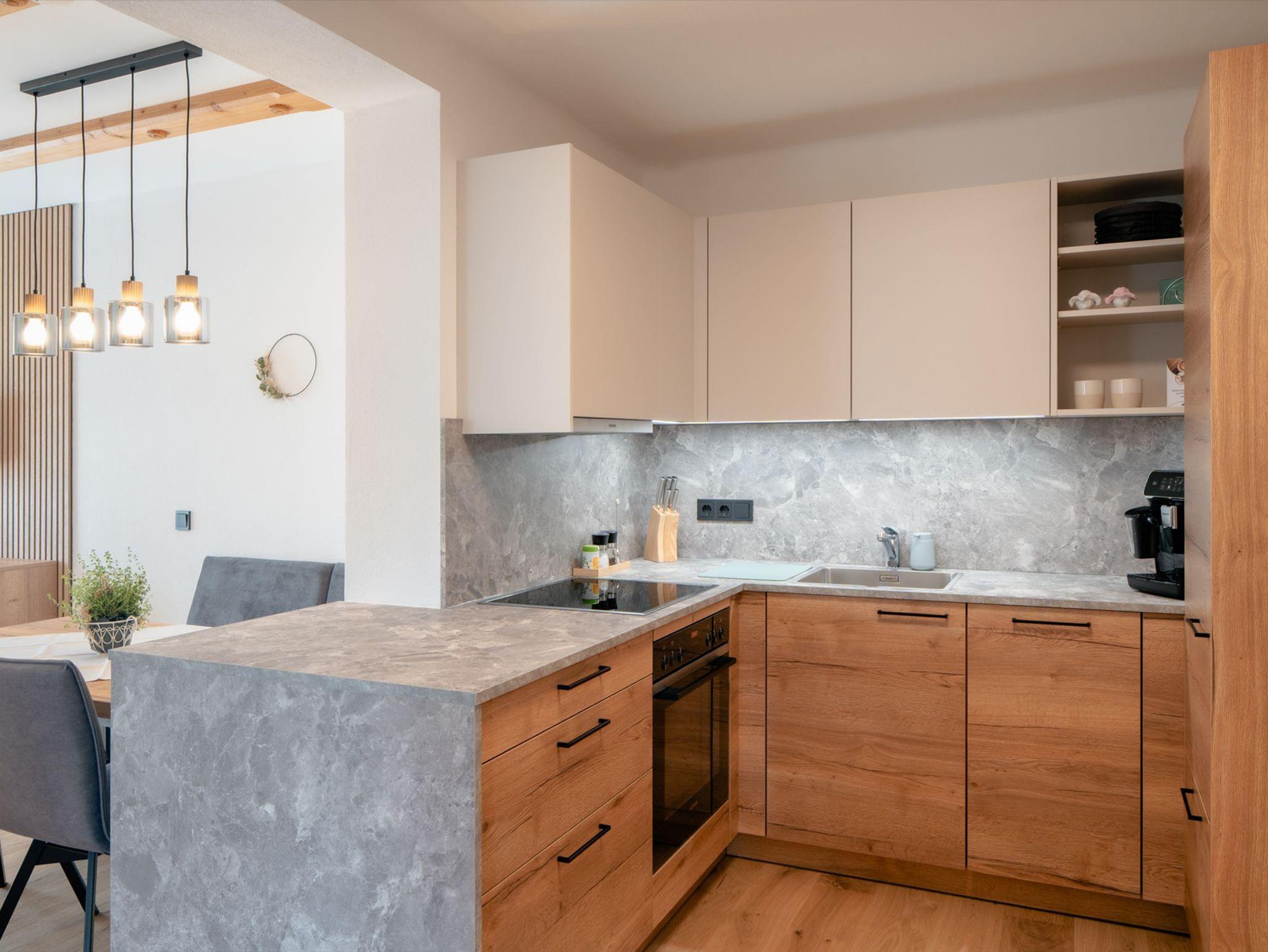 Die gut ausgestattete Küche lädt euch zum gemütlichen Pyjama-Frühstück ein. Zur Ausstattung der Küche zählen z.B.: ein großer Kühlschrank, Kaffeevollautomat, ein Wasserkocher sowie ein Kochfeld mit Backrohr.