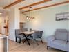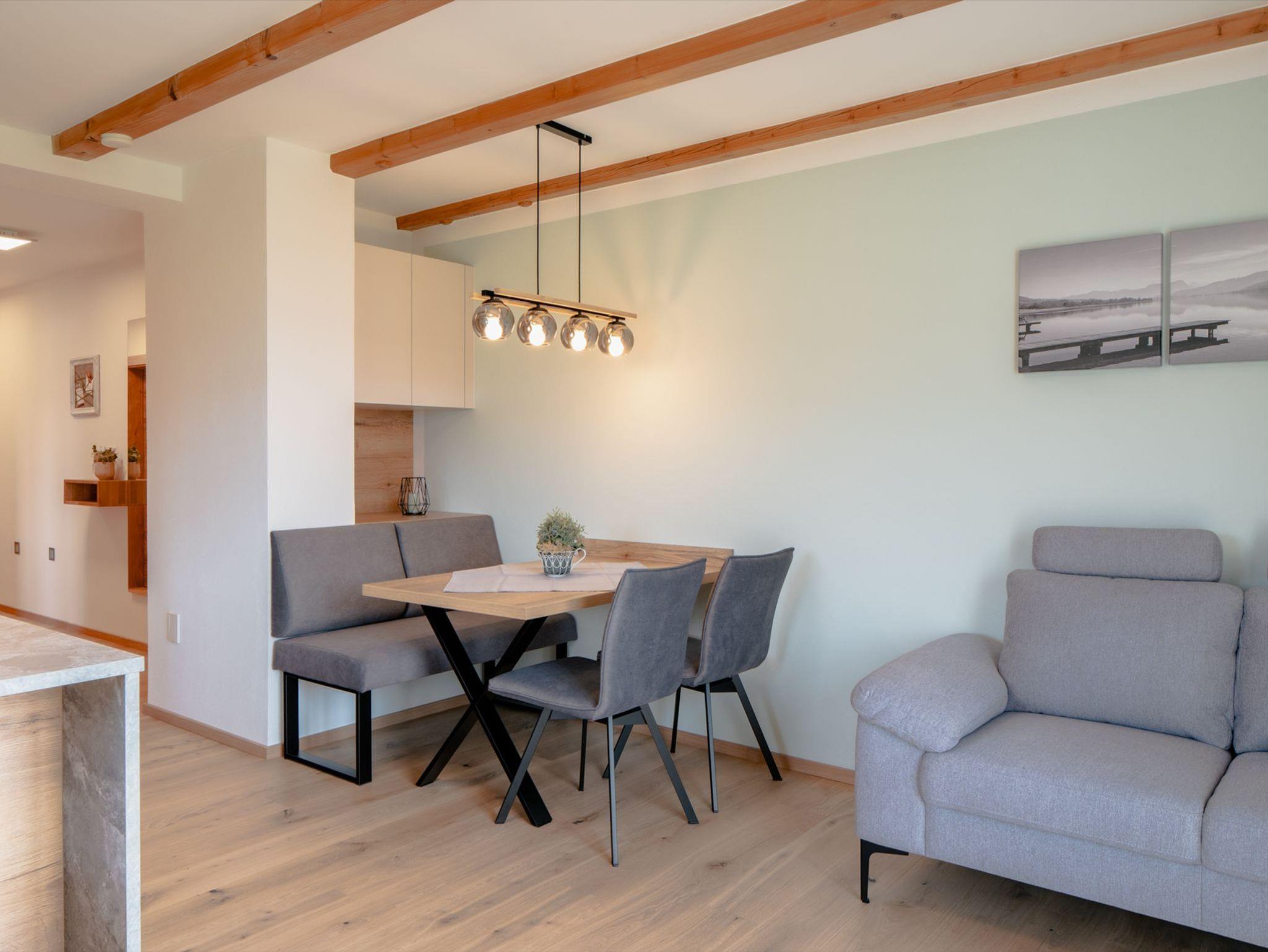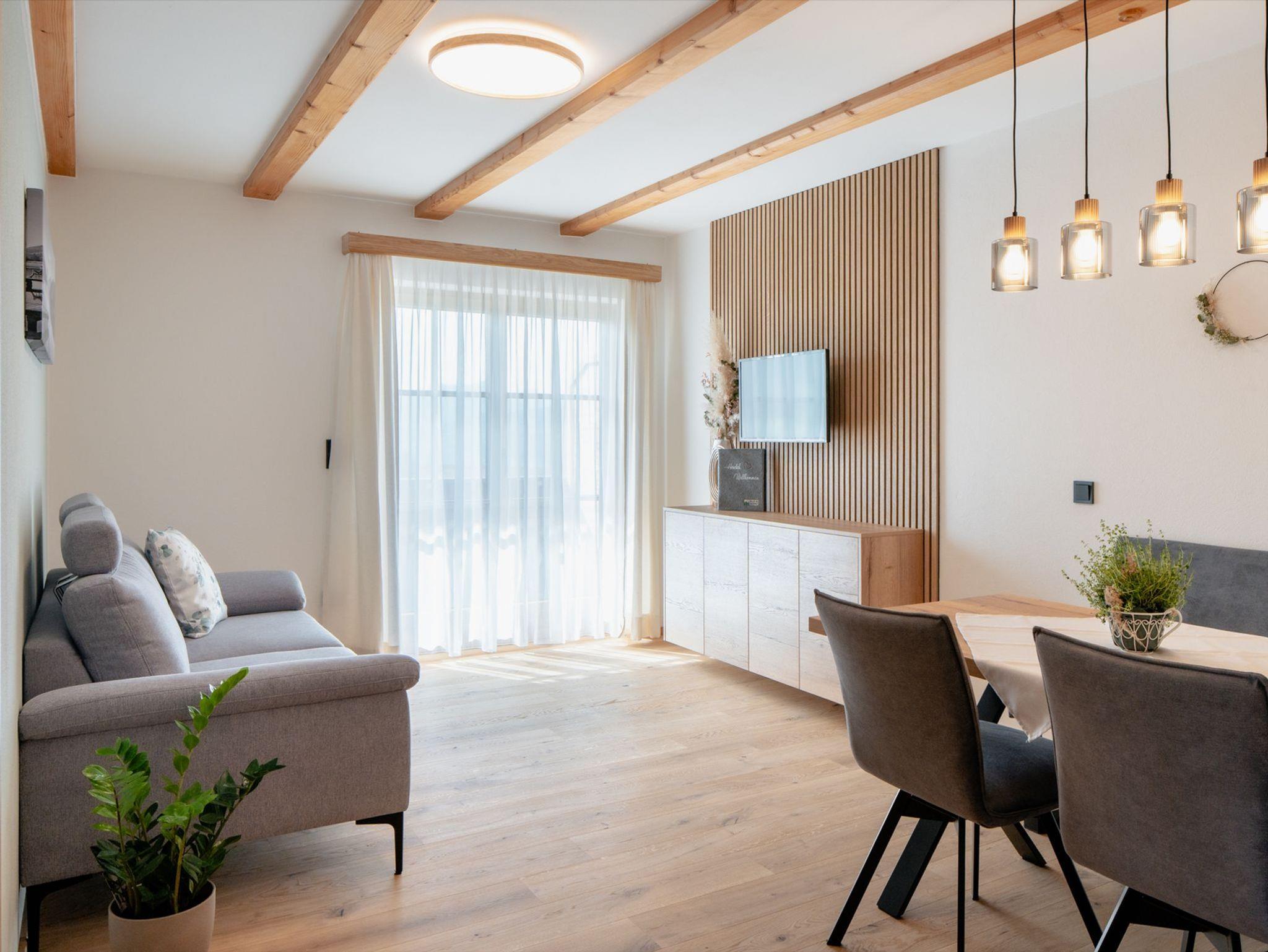 Die Einrichtung in der Ferienwohnung Morgensonne ist geprägt von natürlichen Materialien - Eiche und Fichte sind tonangebend und hochwertige Stoffe in ruhigen Farben runden das Erscheinungsbild harmonisch ab.