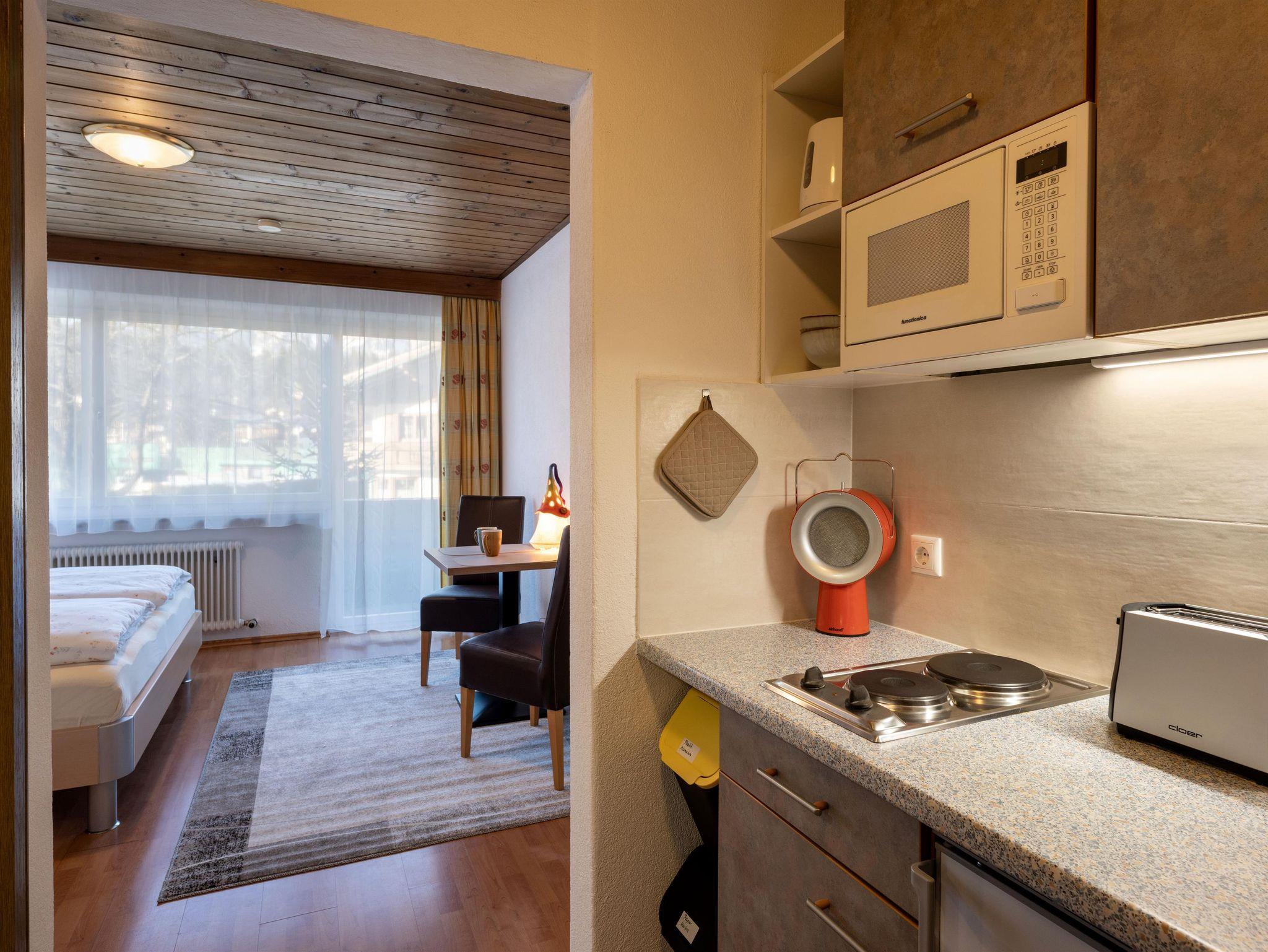 Appartement Enzian: 1-2 Personen. Wohn-Schlafraum mit Küchenblock, Sat-TV, Du/WC, Balkon
